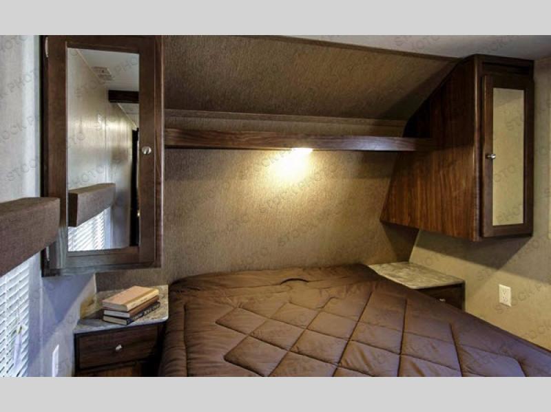 The front bedroom features a queen bed, shirt closets, nightstands, and an overhead shelf plus the second entrance into the trailer from outside, plus more!