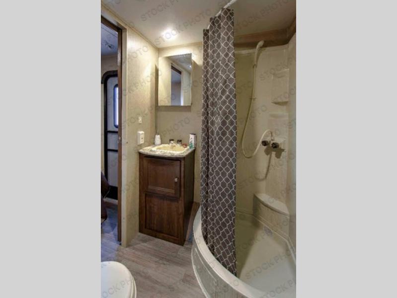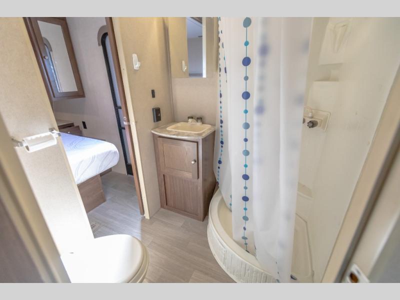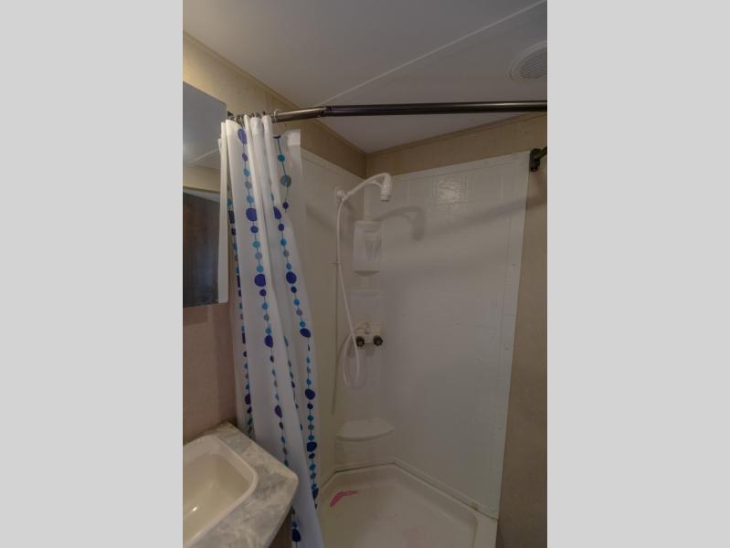 Heading towards the front you will find the bath on your right. There is a corner shower, sink, and toilet plus a second entry from the bedroom.