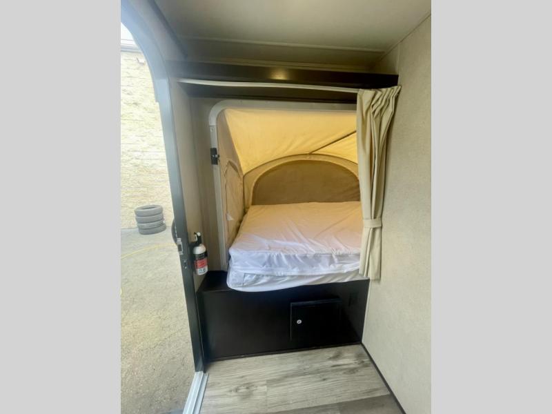 This Kodiak Ultra Lite expandable 172E by Dutchmen RV features front and rear tent end beds for sleeping. Each have a storage shelf above as you enter the tent end bunk.
