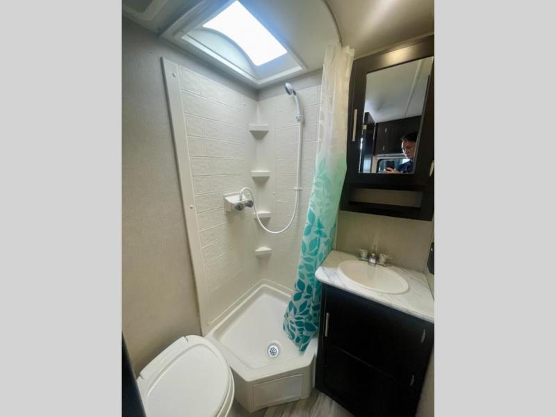 As you enter the main door there is a full bath straight ahead which features a 27" angled shower, toilet, and sink with overhead cabinet for your things.
