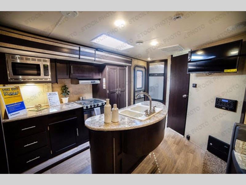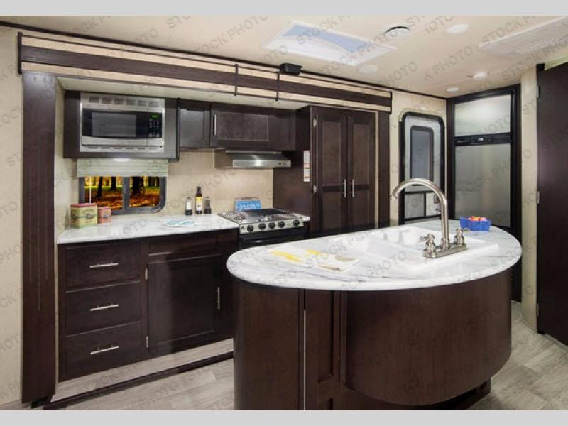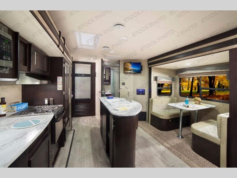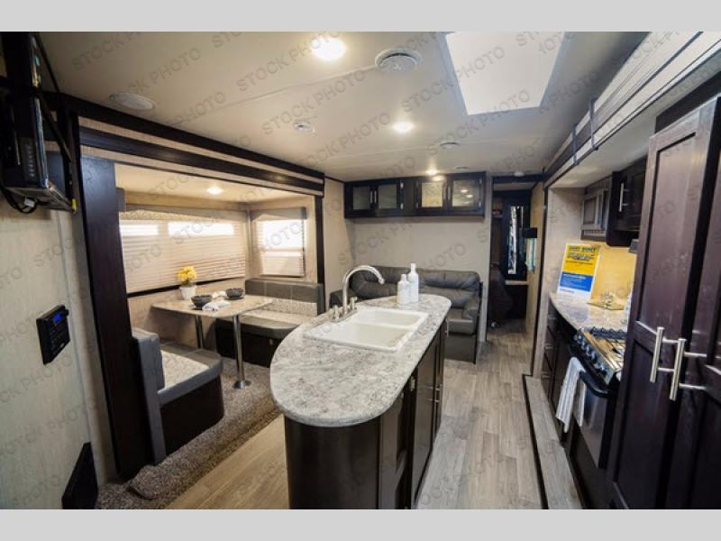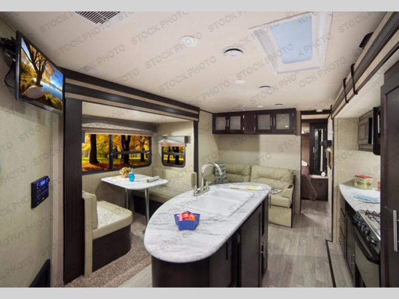 In the living area you will enjoy the added space thanks to dual opposing slides, with one slide out featuring a 40" x 74" booth dinette. There is a sofa adjacent that features overhead cabinets for your things, plus you can easily sleep two more people on either of these seating areas if needed.