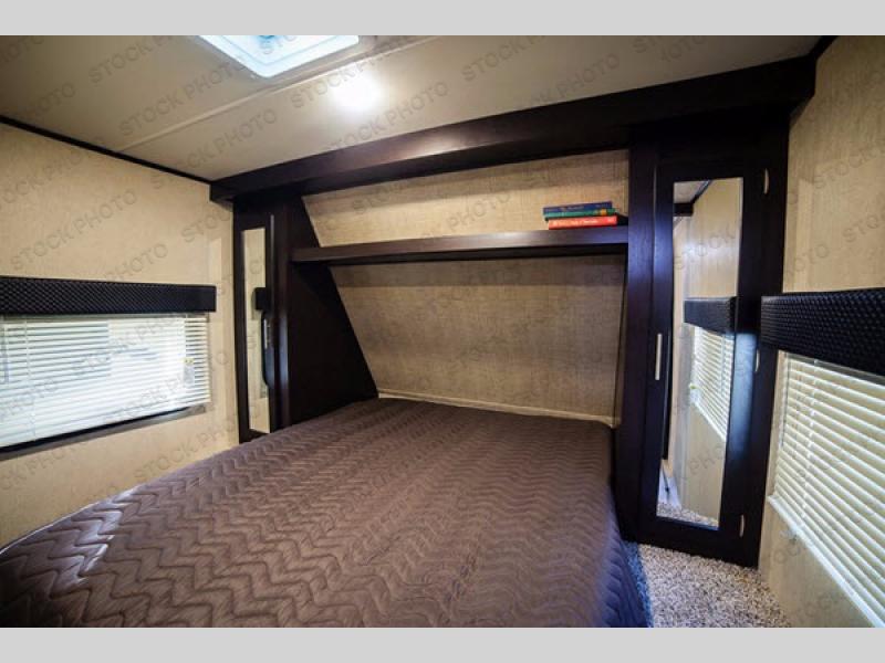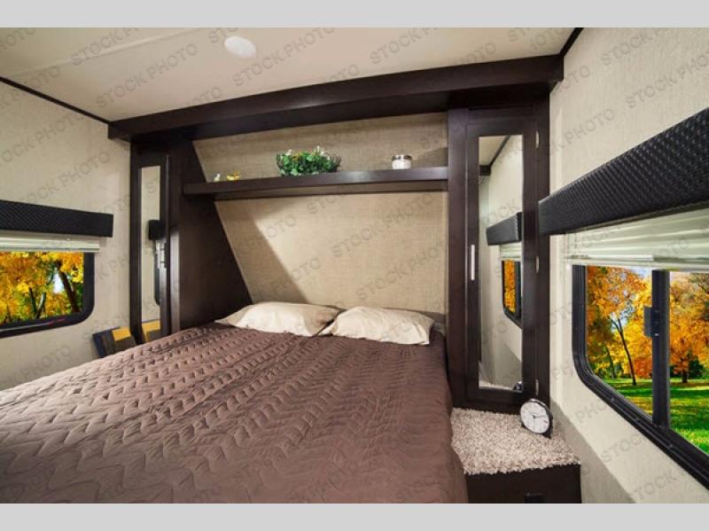 The bedroom is up front behind a sliding privacy door. Here you will enjoy a queen size bed with dual bedside wardrobes and an overhead shelf.