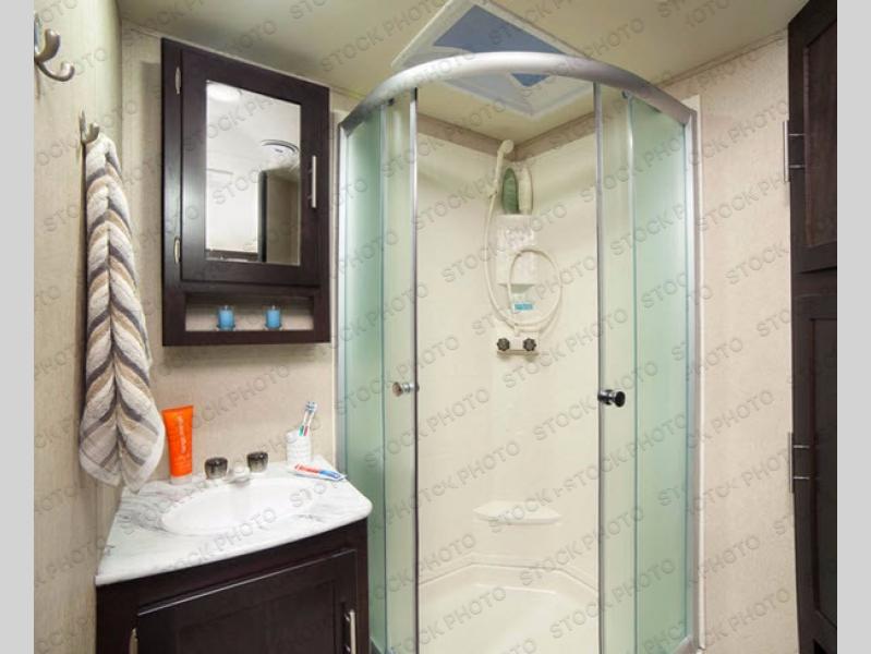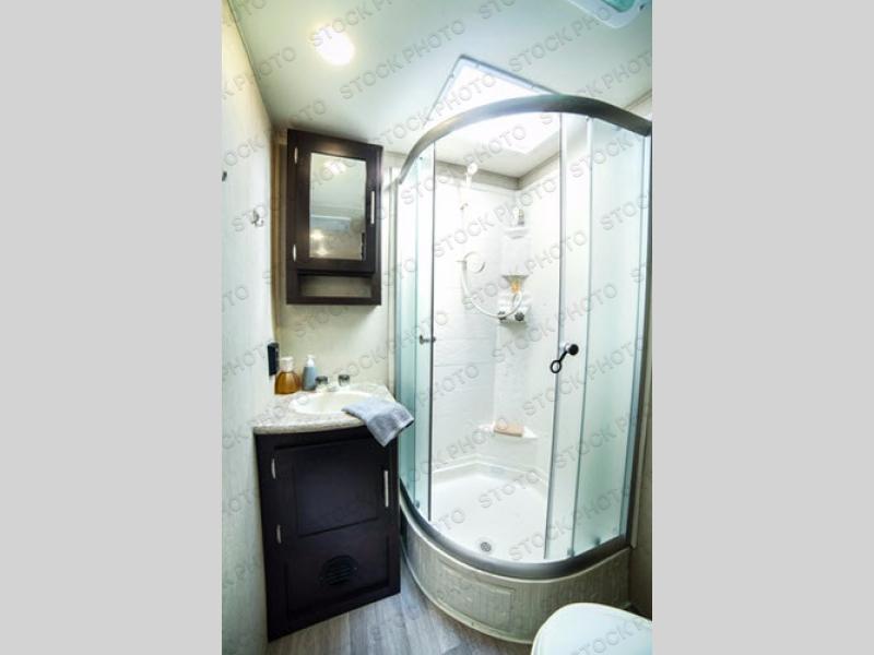 In the right rear corner of the trailer you will find the bathroom featuring a radius shower, toilet, plus vanity with sink and medicine cabinet. There is also an overhead linen cabinet above the toilet.