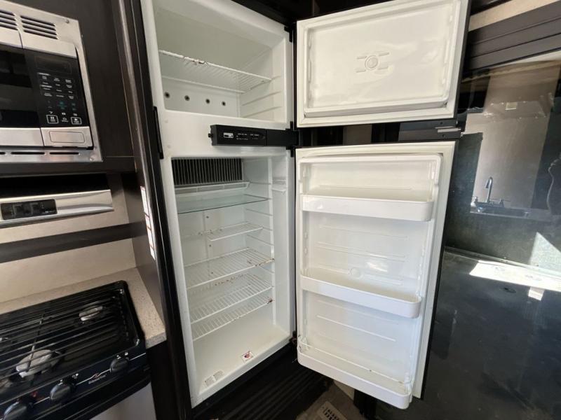 The full kitchen offers all the essentials you need for on-the-road meals. Featuring a cooktop, oven, microwave, deep sink, and a spacious refrigerator, this kitchen makes meal prep easy and enjoyable. Ample cabinet storage keeps supplies organized, so you always have what you need at your fingertips.