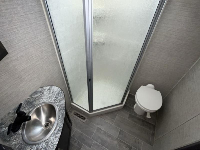The front master bedroom delivers a peaceful retreat with a comfortable bed and convenient storage options for your clothing and personal items. The bathroom features a shower, toilet, and vanity, giving you all the comforts of home while camping.