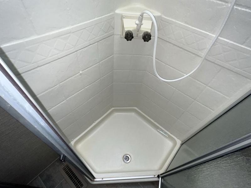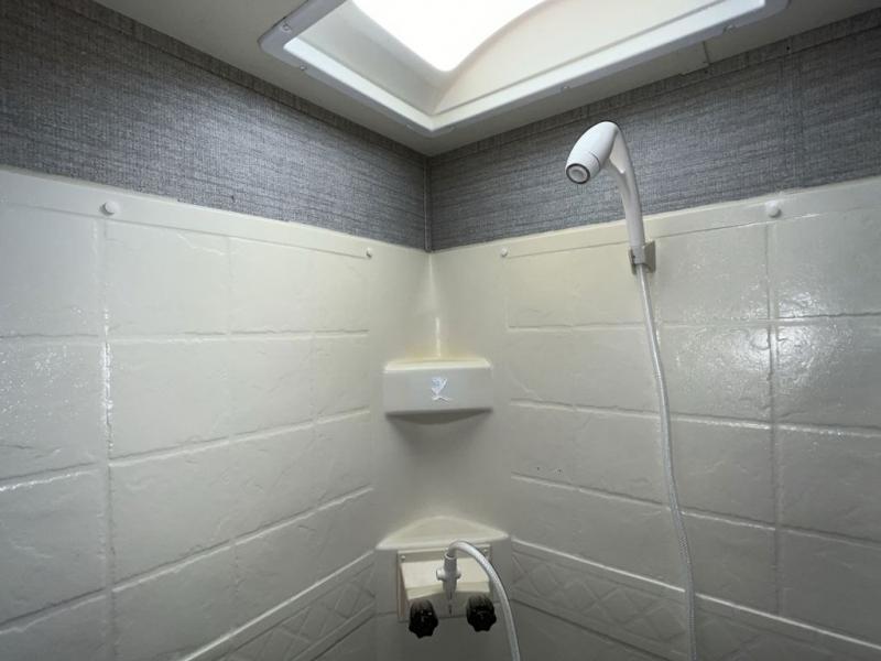 Shower, toilet, and vanity provide home-style comfort at camp.