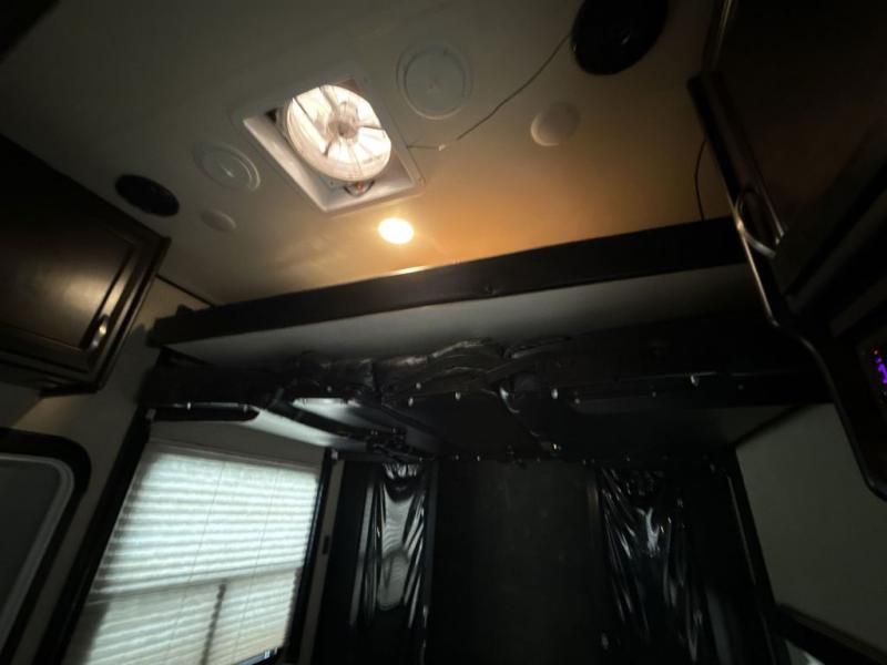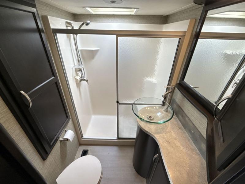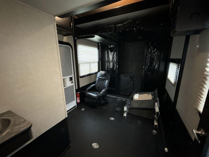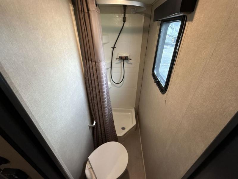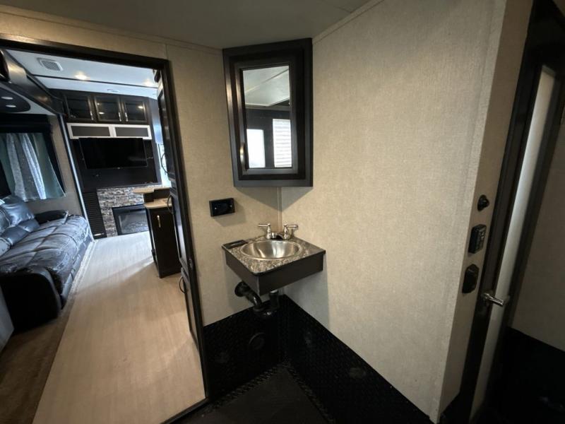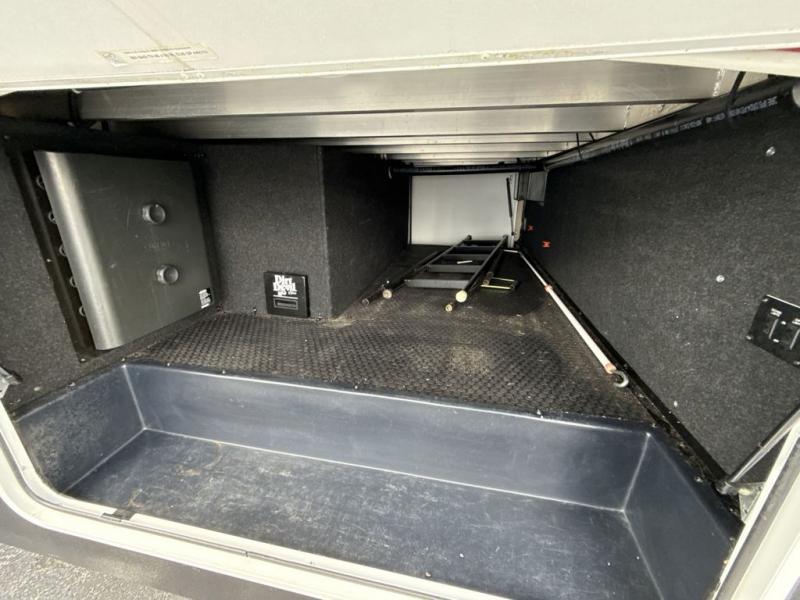 Step inside the rear 8' spring assist ramp door to a 12'6" garage space for your toys. Inside find plenty of storage for your gear, along with a side entry door. There is also a bath with toilet and shower, plus separate sink and a twin loft bed above.