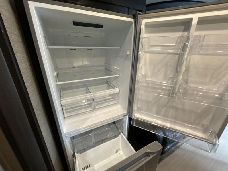 Further inside the main living area you will find a combined kitchen and living room with slide out 18 cu. ft. refrigerator, and sofa slide out along the road side wall. There is also a kitchen area with pantry, a three burner range with overhead microwave oven, and an L-shaped counter with raised bar top and two bar stools to the left of the main side entrance. There is also a double sink for cleaning up.