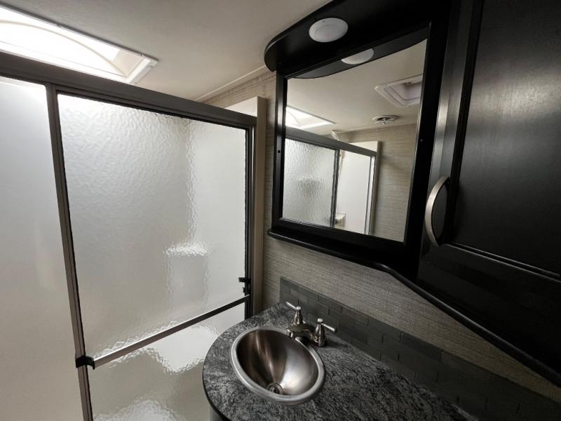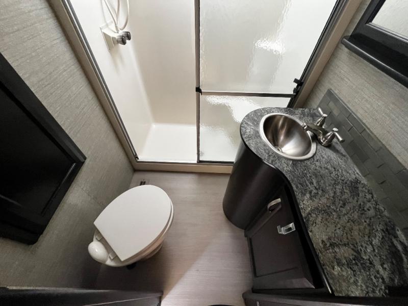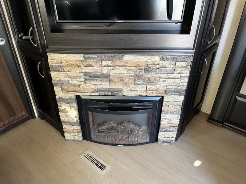 As you make your way into the main living area from the garage you will see a large sofa lounge slide out with a stowable table for dining along the curb side. There is TV with fireplace below on the outer half bath wall for easy viewing.