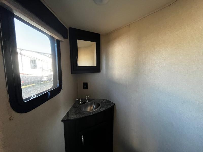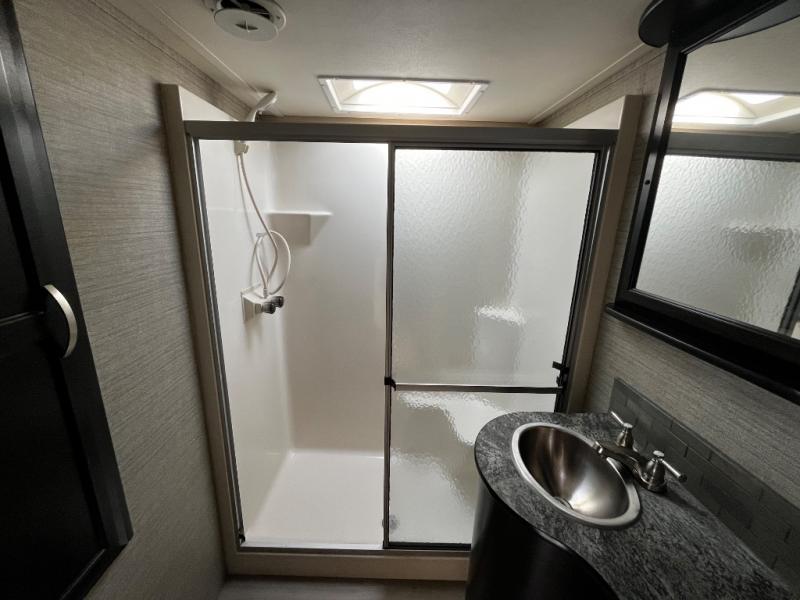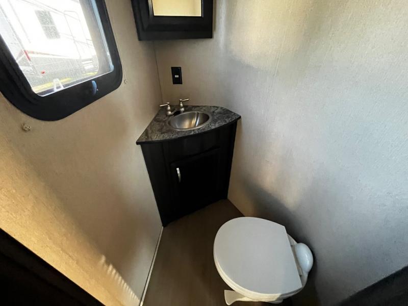 The 8' zero gravity rear ramp door will make loading and unloading a breeze into the 11' cargo space provided. There is a 40" x 88" twin loft bed, and a TV overhead cabinet in the cargo, plus a convenient half bath as well. You can dine at the dual sofas with table top, and sleep on the lay flat Happy-jack power bunk in the rear. The side man door allows quick and easy access to your toys and the half bath.