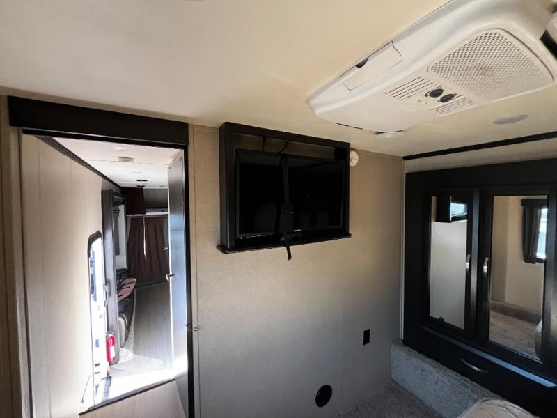 Continue down the hall to the front private bedroom with sliding pocket door. There is a queen bed with storage above and below including nightstands on both sides of the bed. You will also find a slide out double wardrobe, and a TV.