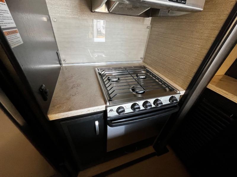 The kitchen features a slide out refrigerator, and a three burner range with microwave above. The counter peninsula features a double sink and overhead storage area. There is also a storage closet near the counter straight in from the main entry door.