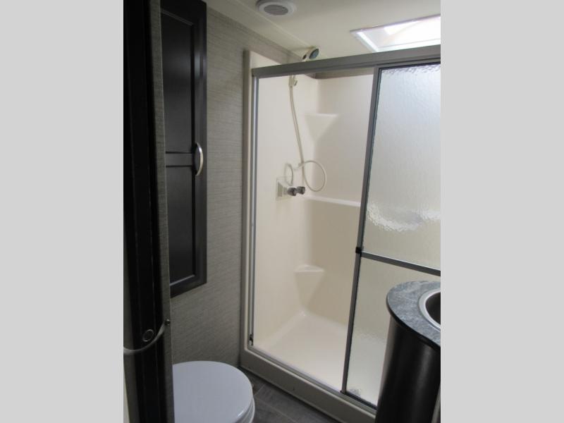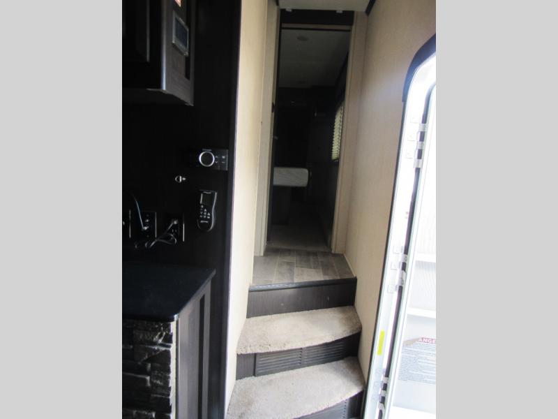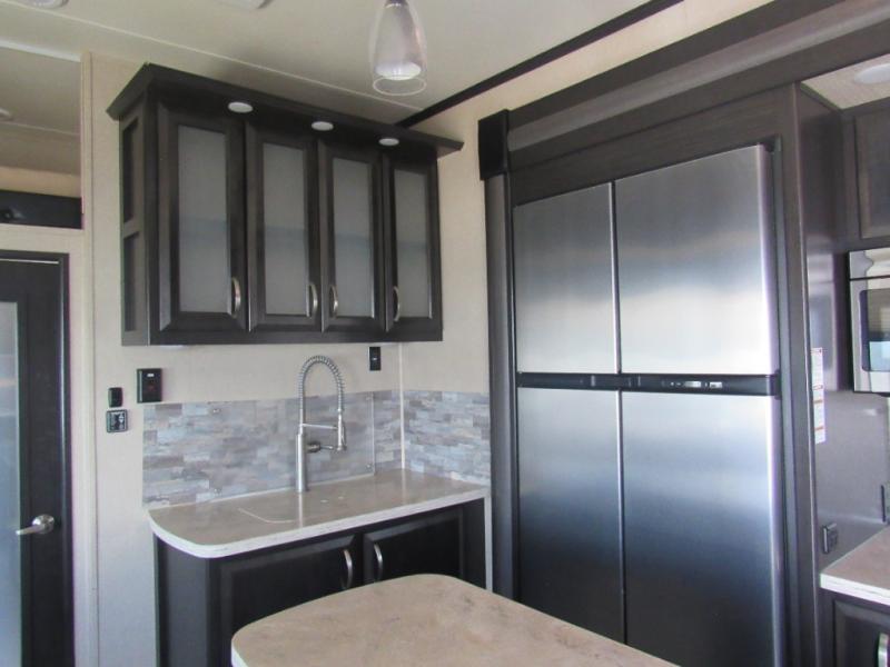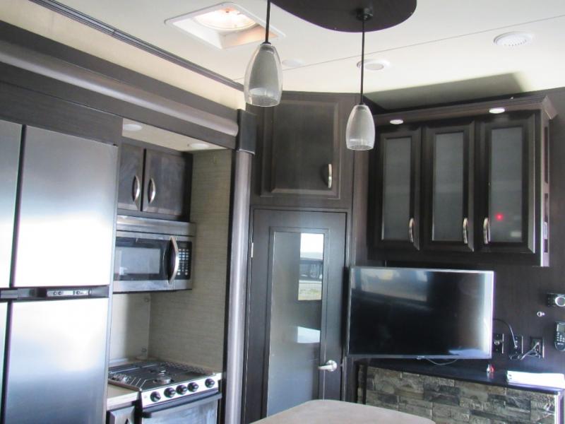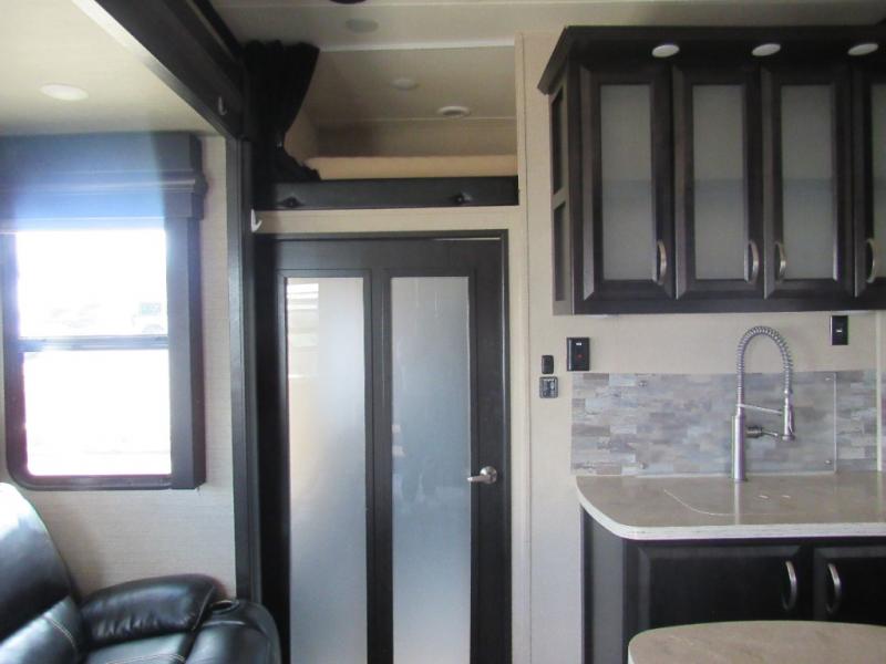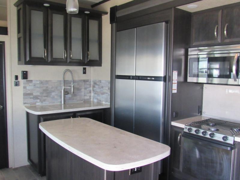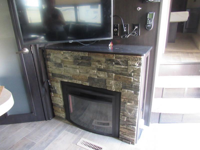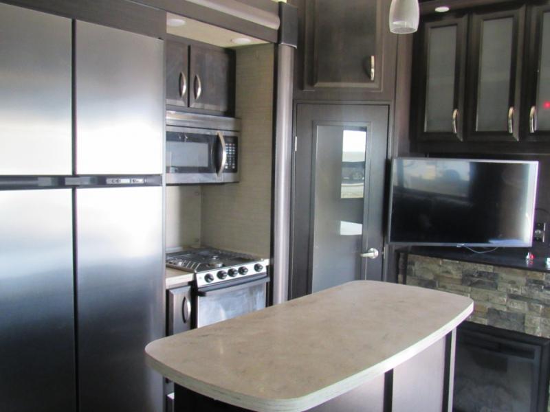 Once inside you will notice a wide open combined living space featuring the kitchen and living area complete with dual opposing slides. There is a slide out large sofa along the curb side wall with a stowable table. Straight in through the door, and along the interior wall, you will find an entertainment center with TV and fireplace. There is also a corner pantry along this wall as well.