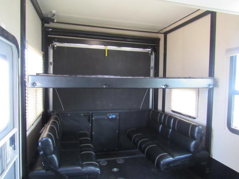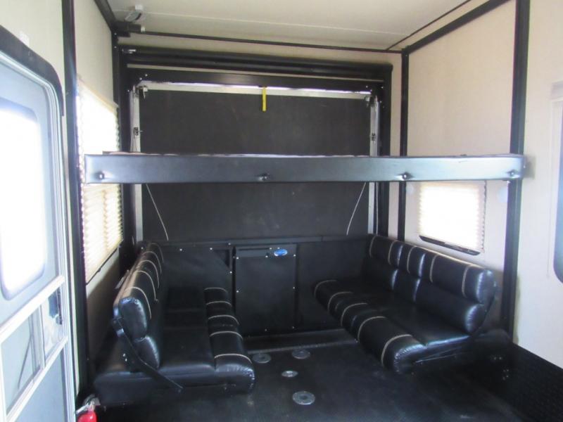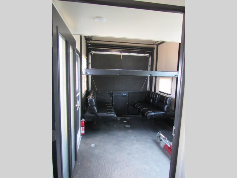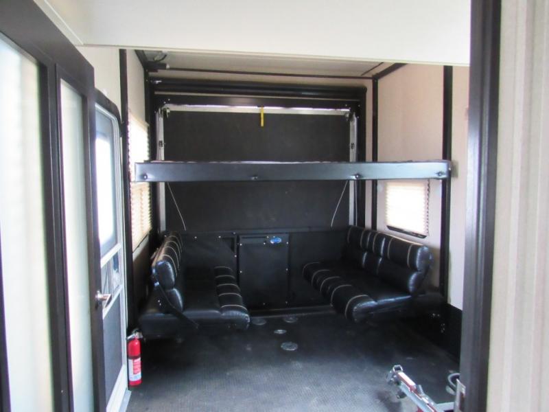 Model V3655 makes it easy to load and unload into the 12' 6" garage space using the 8' zero gravity ramp door. Inside you will find a lay flat Happy-jack power bunk with sofas below facing one another, and a table top between. There is also a twin bed loft in the front of this space that a few might be drawing straws for! Once your gear is secure and the rear ramp door is closed, you can easily access the cargo area using the side man door. From here there is entry into the main living space, or you can use the curb side entrance door closer to the front.
