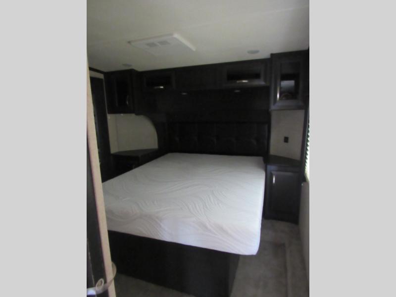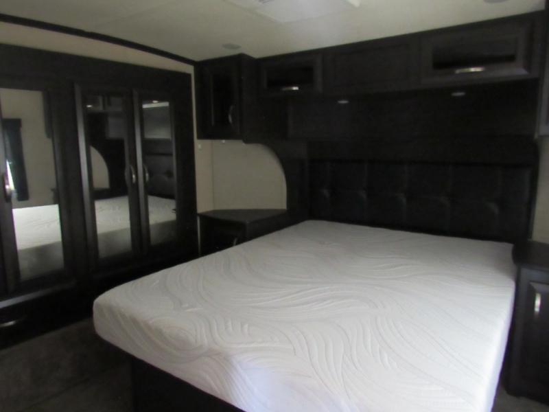 In the very front through a sliding door you will find a spacious retreat featuring a queen bed with storage above and below. There are nightstands on either side of the bed, a TV, plus a slide out double wardrobe too.