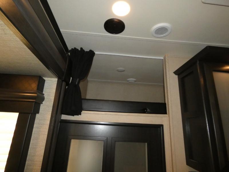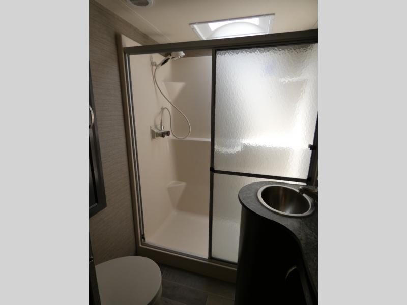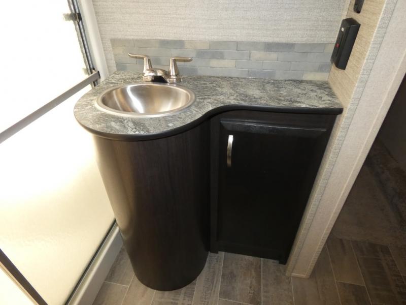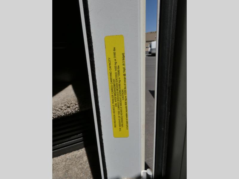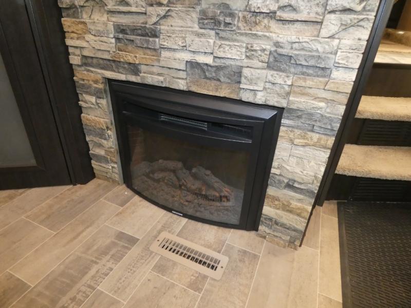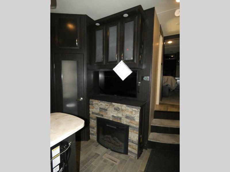 Once inside you will notice a wide open combined living space featuring the kitchen and living area complete with dual opposing slides. There is a slide out large sofa along the curb side wall with a stowable table. Straight in through the door, and along the interior wall, you will find an entertainment center with TV and fireplace. There is also a corner pantry along this wall as well.