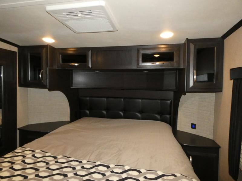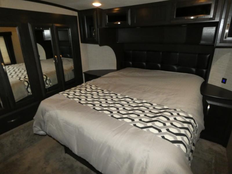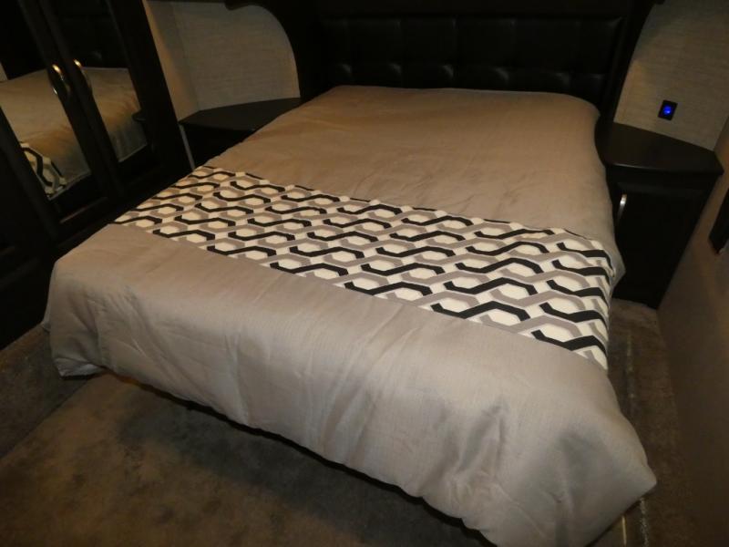 In the very front through a sliding door you will find a spacious retreat featuring a queen bed with storage above and below. There are nightstands on either side of the bed, a TV, plus a slide out double wardrobe too.