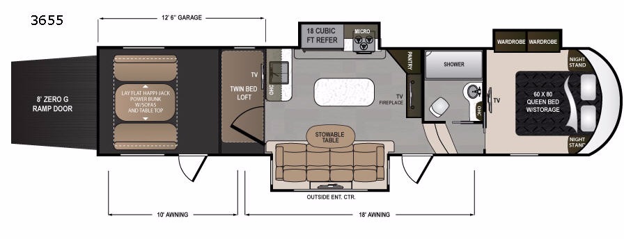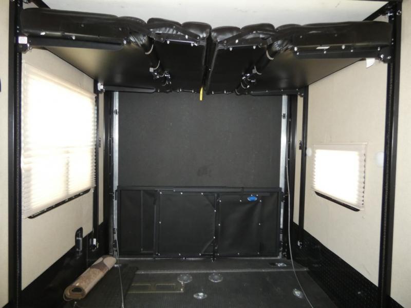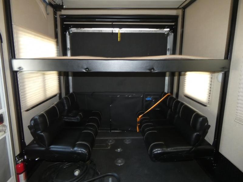 Model V3655 makes it easy to load and unload into the 12' 6" garage space using the 8' zero gravity ramp door. Inside you will find a lay flat Happy-jack power bunk with sofas below facing one another, and a table top between. There is also a twin bed loft in the front of this space that a few might be drawing straws for! Once your gear is secure and the rear ramp door is closed, you can easily access the cargo area using the side man door. From here there is entry into the main living space, or you can use the curb side entrance door closer to the front.