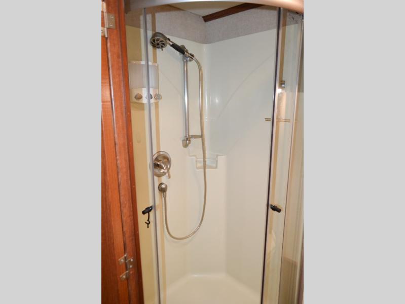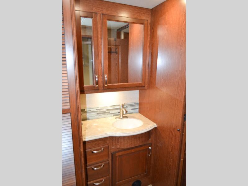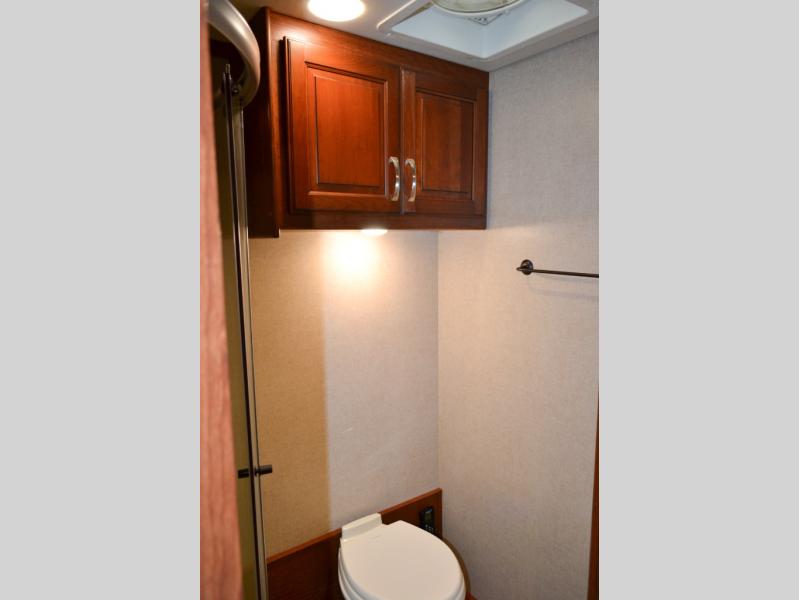 The bathroom has a private toilet and shower area on one side of the motor home. On the opposite side there is a sink and medicine cabinet.