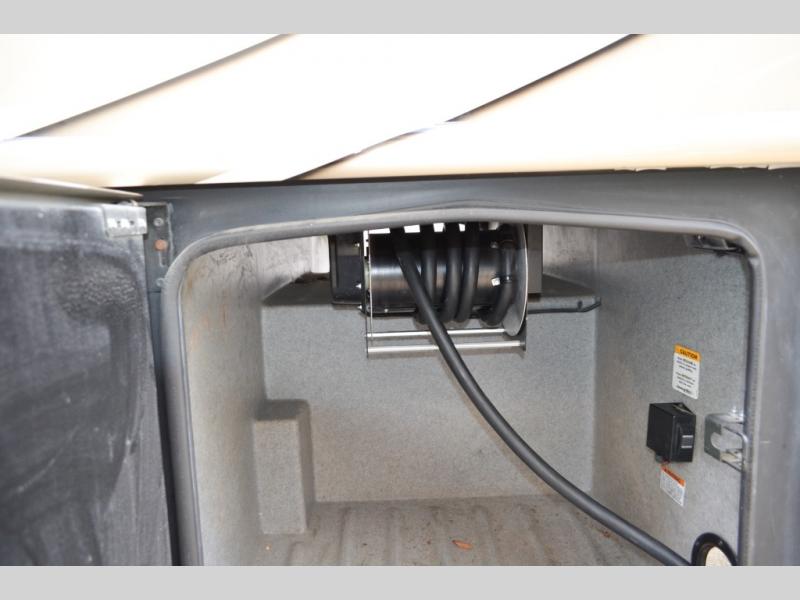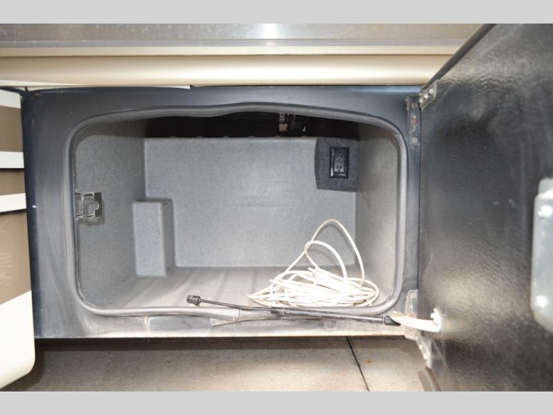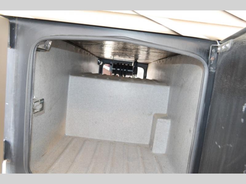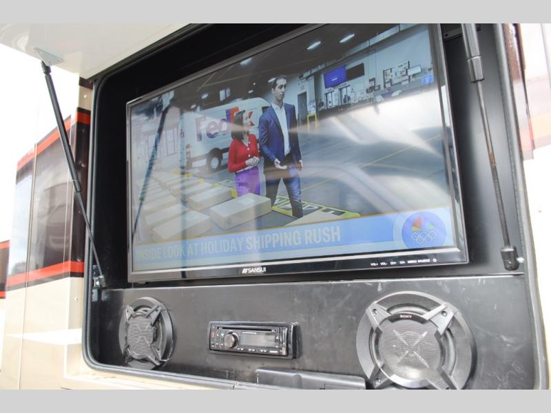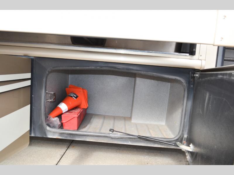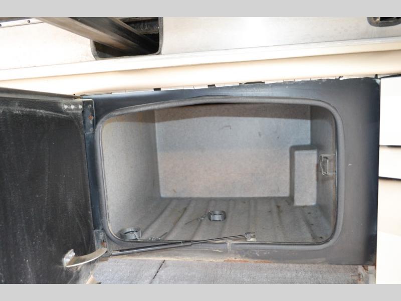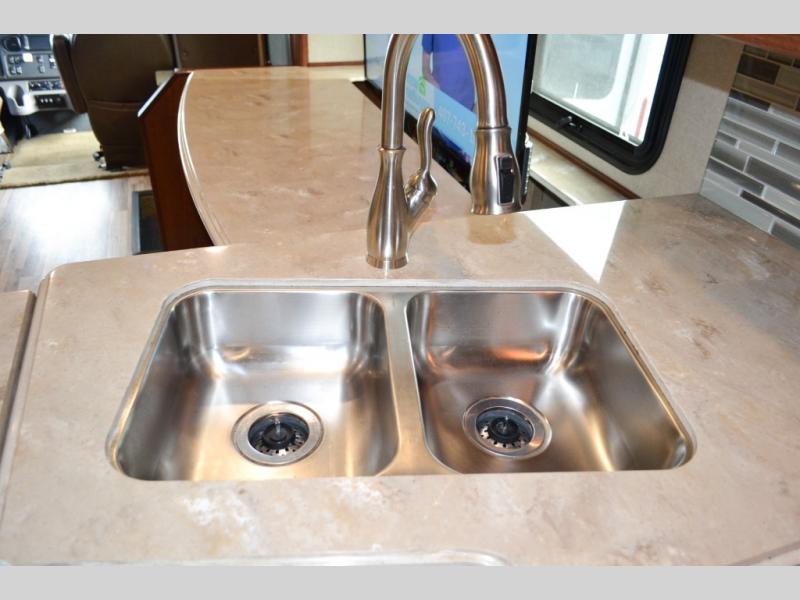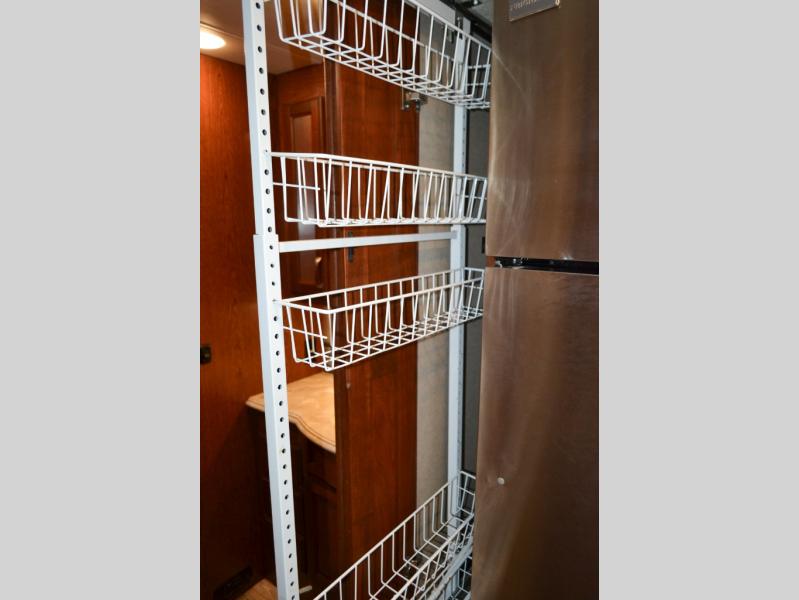 As you enter this model you will see to the left of the entrance, a slide with a lounge, double kitchen sink, three burner range, and microwave. Next to the slide out there is a large pantry. Along the opposite side of the motor home the slide has a Dream dinette and a hide-a-bed sofa with overhead cabinet. Next to the slide there is a refrigerator and additional pantry. Above the cab, the cab over bunk provides additional sleeping space. There is also a 39" TV on an electric swivel bracket in the cab.