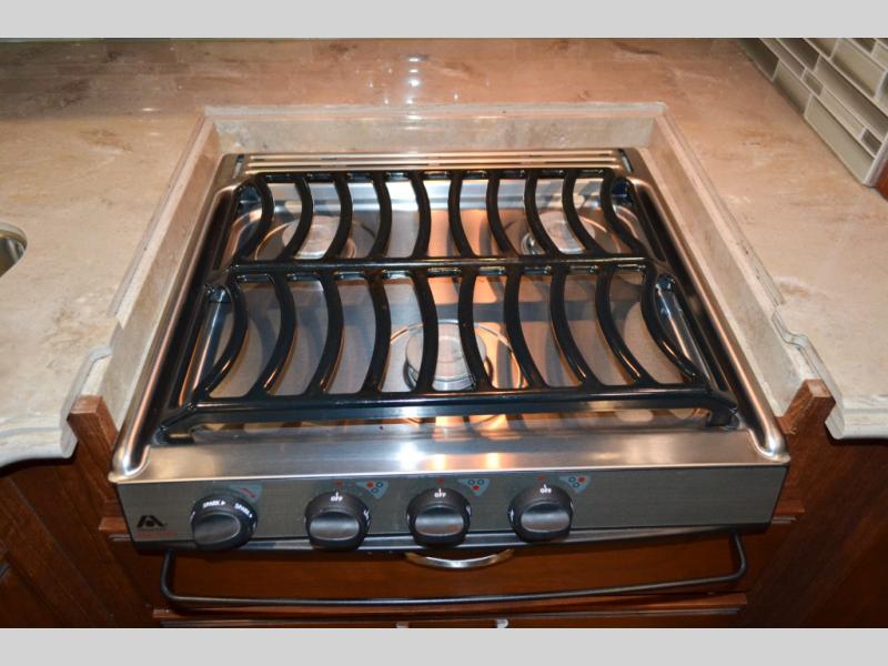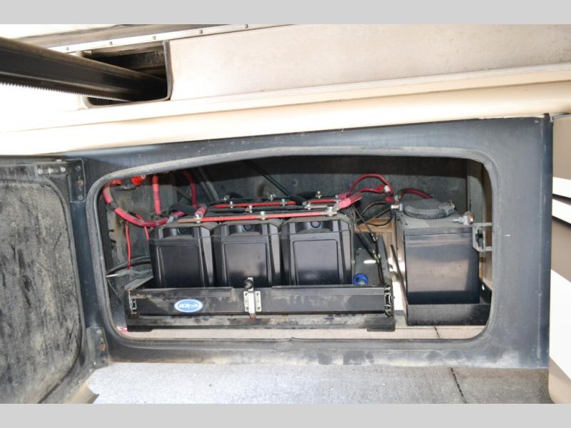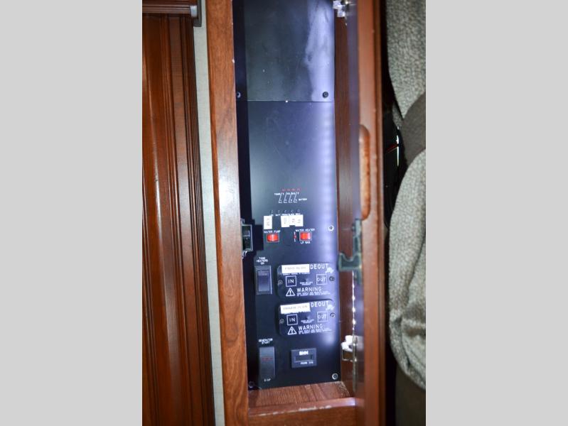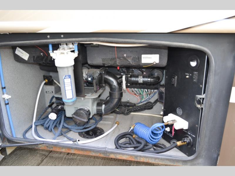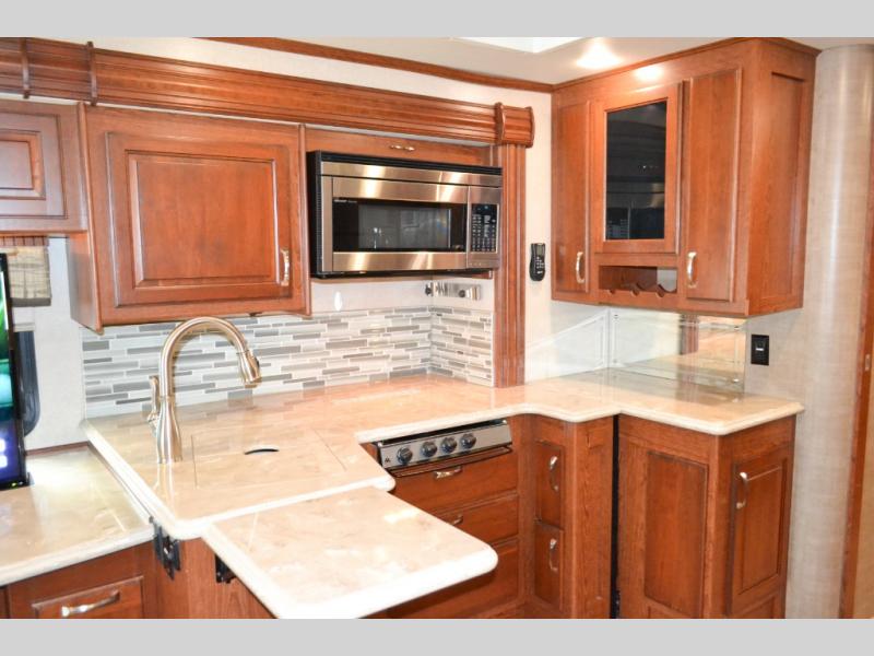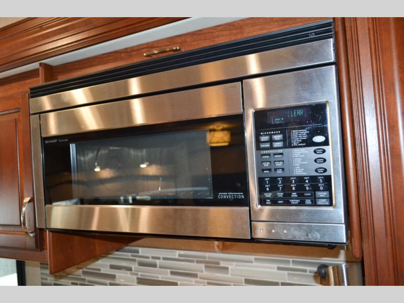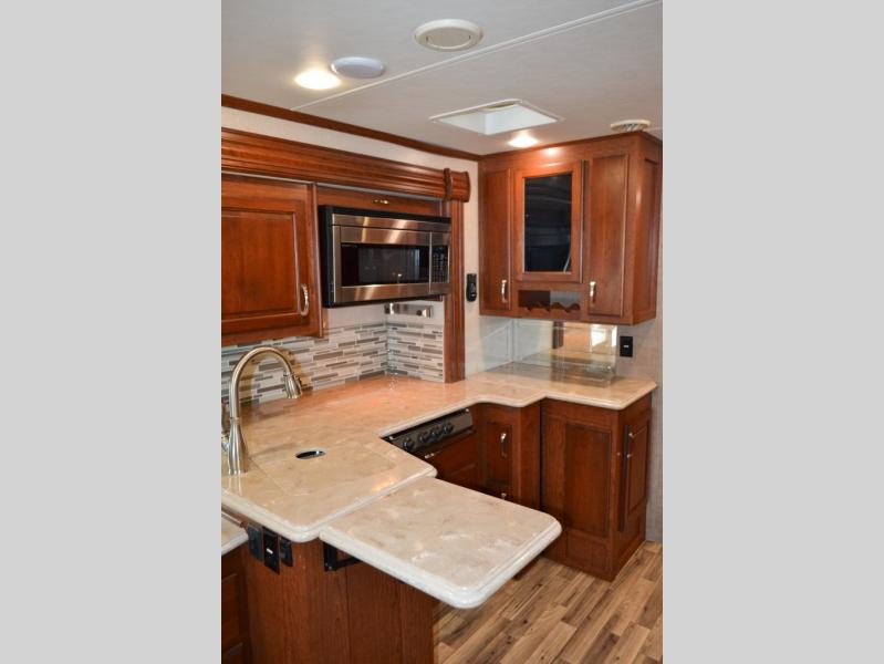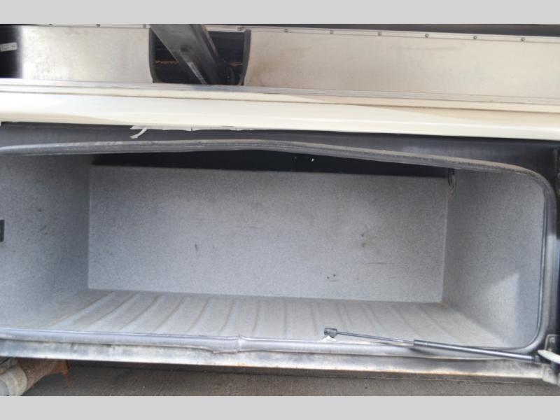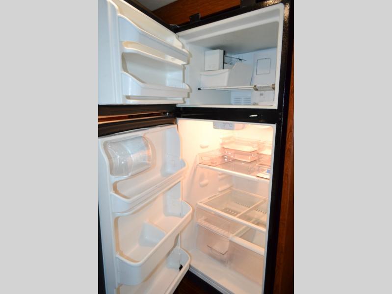 As you enter this model you will see to the left of the entrance, a slide with a lounge, double kitchen sink, three burner range, and microwave. Next to the slide out there is a large pantry. Along the opposite side of the motor home the slide has a Dream dinette and a hide-a-bed sofa with overhead cabinet. Next to the slide there is a refrigerator and additional pantry. Above the cab, the cab over bunk provides additional sleeping space. There is also a 39" TV on an electric swivel bracket in the cab.