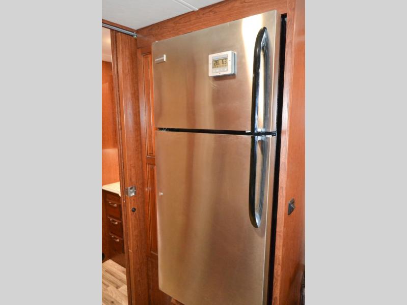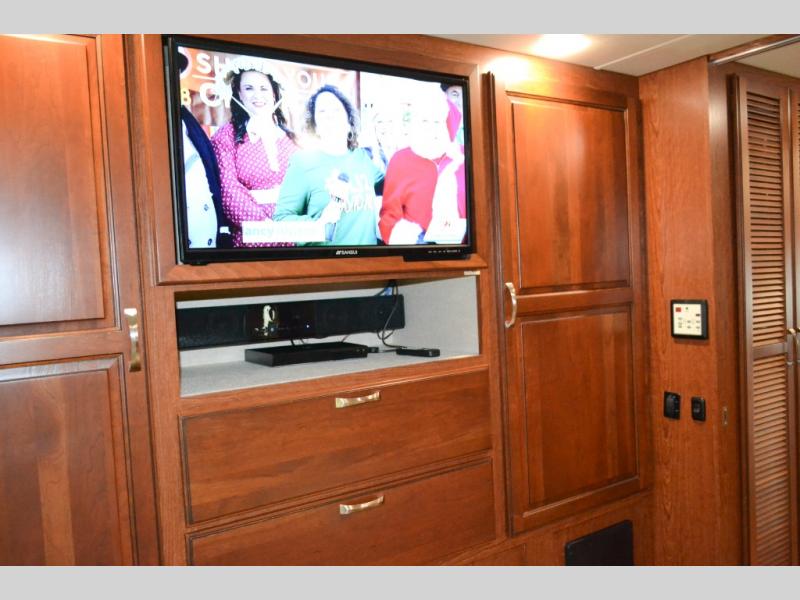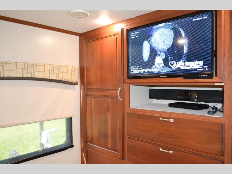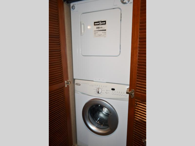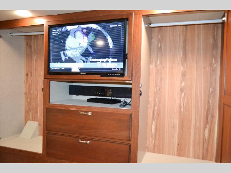 Just before you enter into the bedroom you will find a large closet or you can choose to have an optional washer/dryer. Inside the room along one side there is a closet, 32" TV, a set of drawers, and a wardrobe. On the opposite side you will find a slide with a king bed, or you can choose an optional queen, and more!