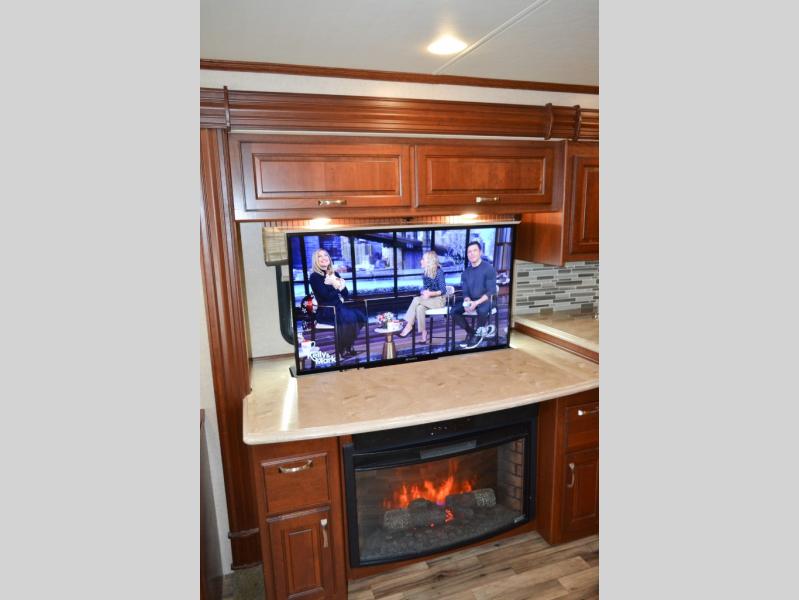 Theater Seats Across From Flatscreen TV On Lift & Electric Fireplace