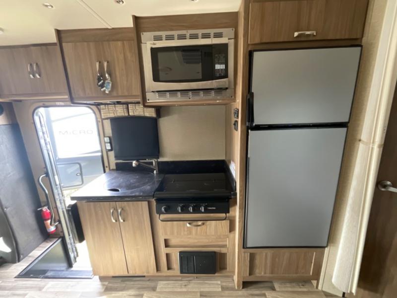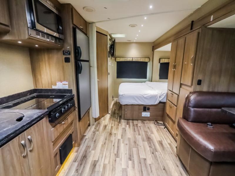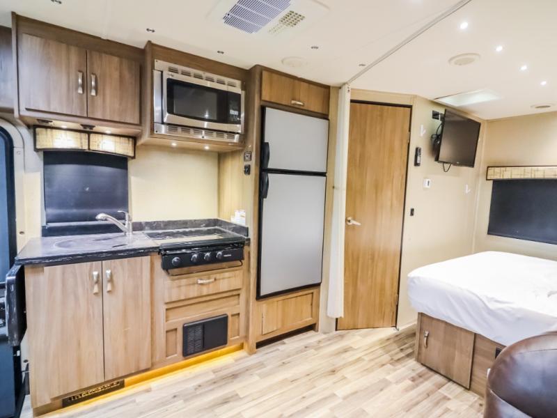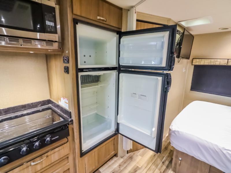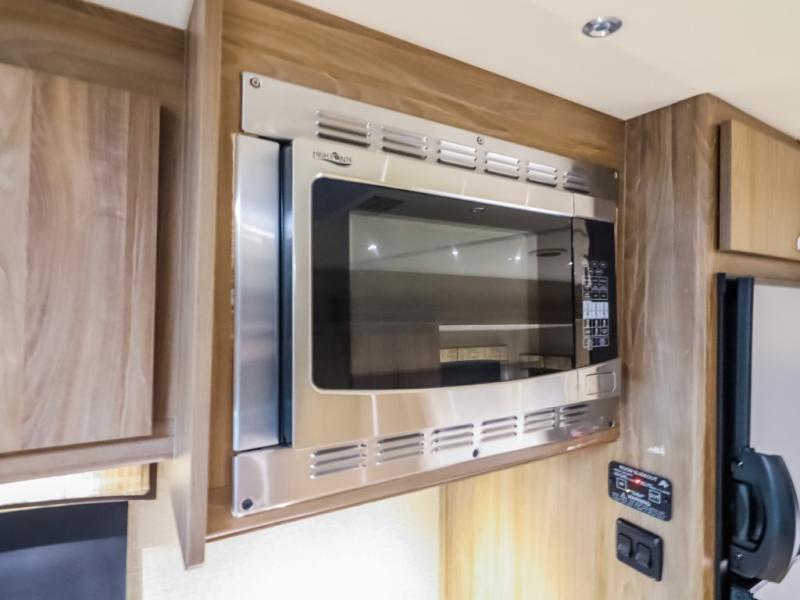 To the left of the main entry door you will find the kitchen appliances which include a round single bowl sink, a three burner range with overhead microwave oven, and a refrigerator. There is also overhead storage for dishes and things you might need. Here you can easily create great meals and snacks while on the move!