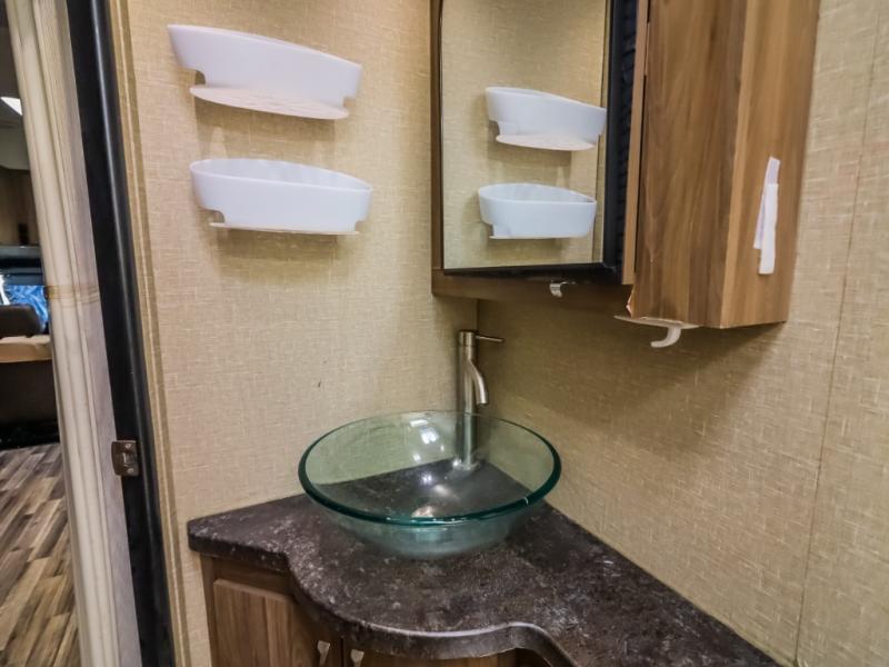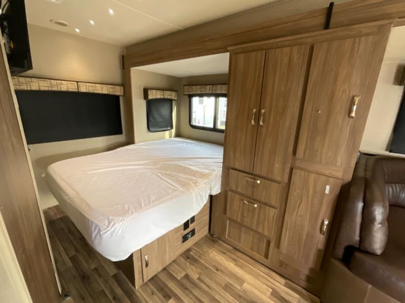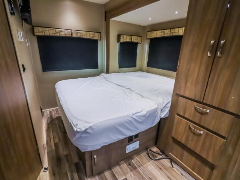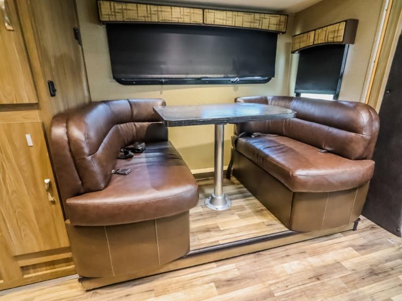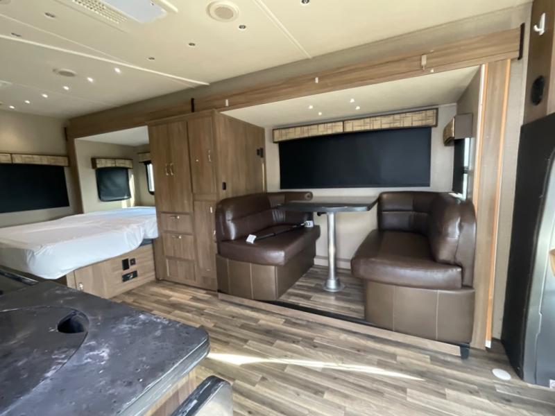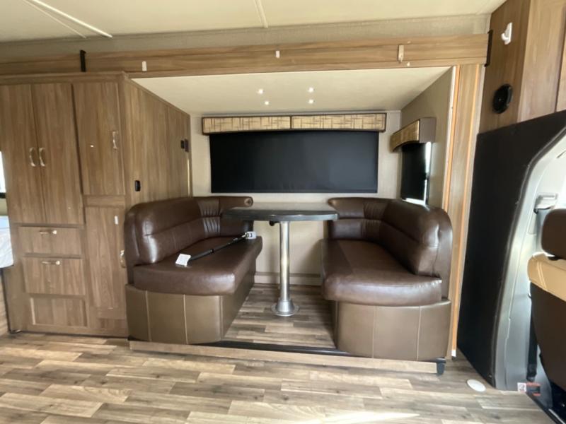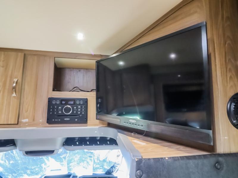 Step inside just behind the front passenger seat and find an overhead cabinet above the door. Above the cab you will find a 32" LED TV as well as overhead cabinets. There is a full wall slide out along the driver's side which creates a nice open feel inside. The slide contains a booth dinette, pantry, wardrobe, and queen size bed.