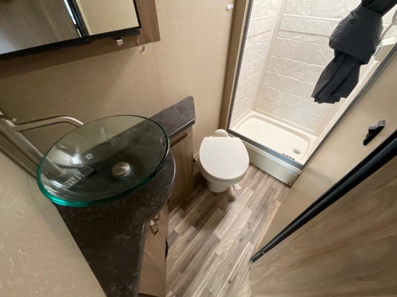 The rear left corner offers a complete bath with tub/shower, toilet, and vanity with sink. There is also an overhead cabinet for your things.
