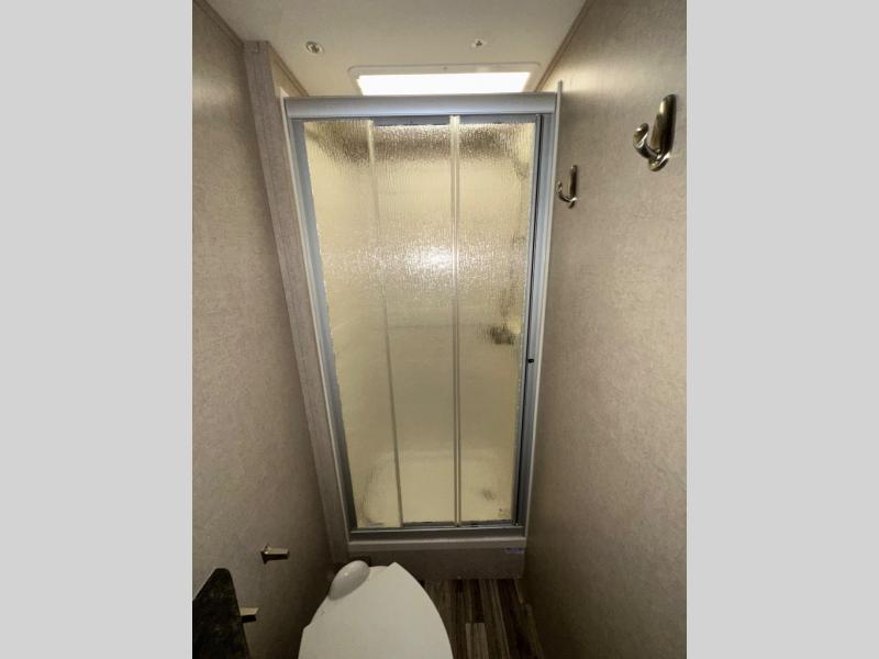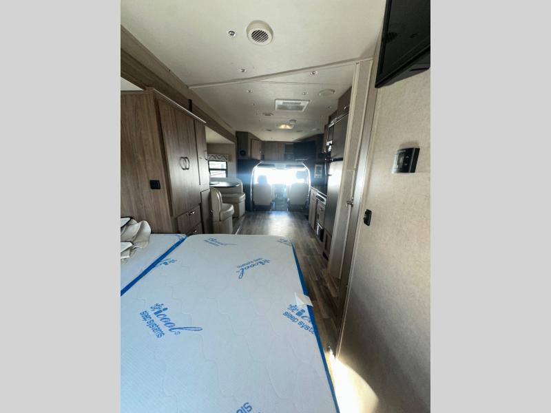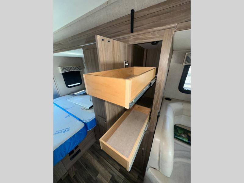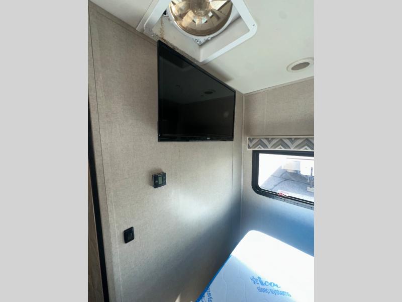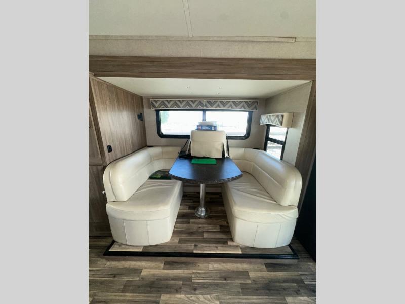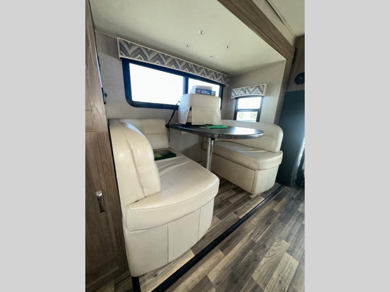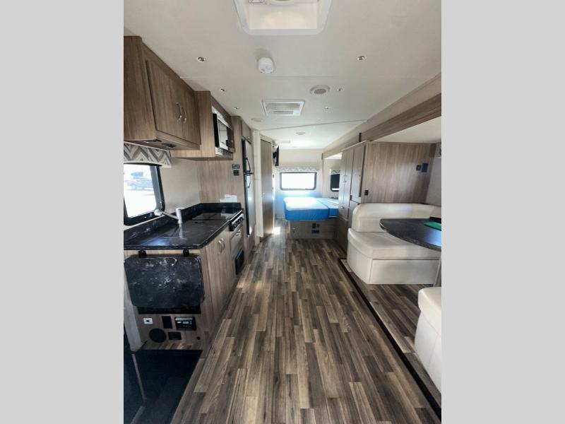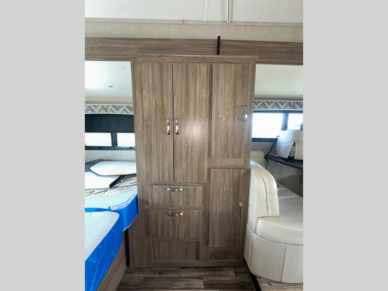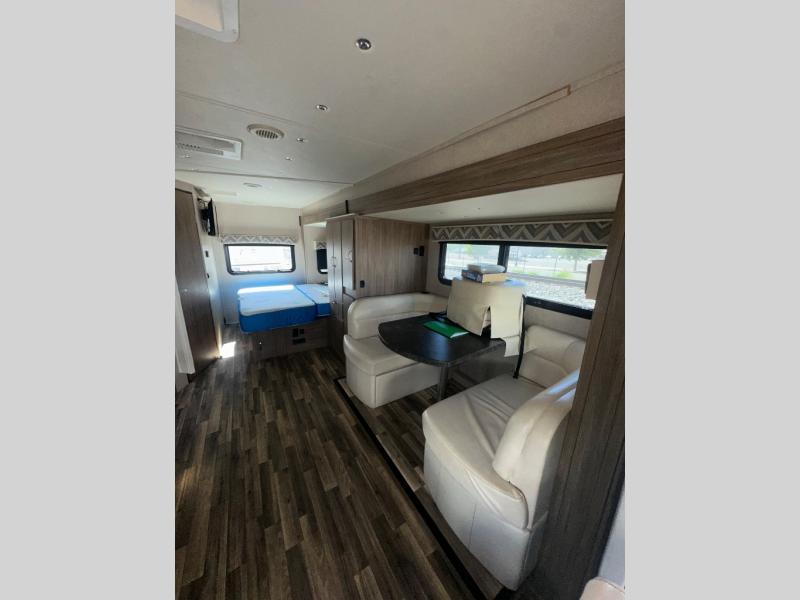 INTERIOR PHOTOS COMING SOON!Step inside just behind the front passenger seat and find an overhead cabinet above the door. Above the cab you will find a 32" LED TV as well as overhead cabinets. There is a full wall slide out along the driver's side which creates a nice open feel inside. The slide contains a booth dinette, pantry, wardrobe, and queen size bed.