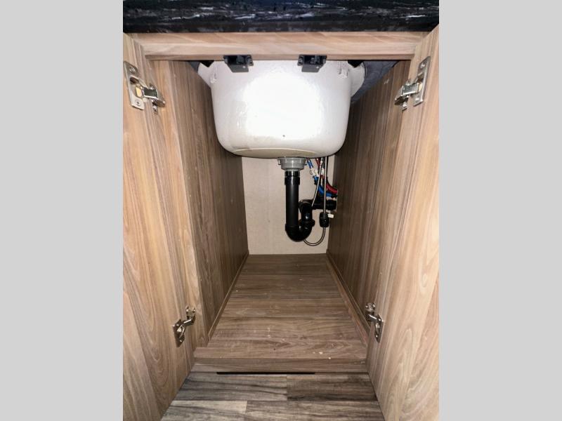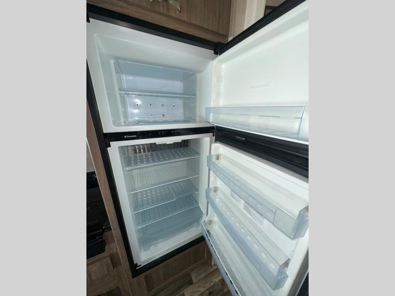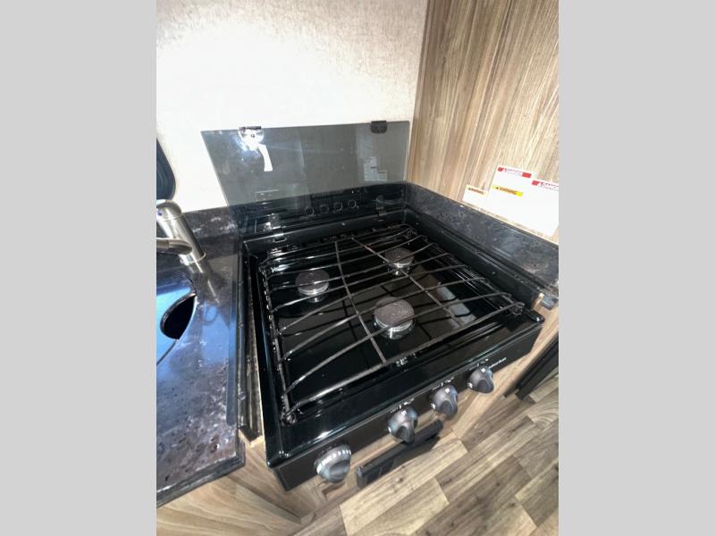 To the left of the main entry door you will find the kitchen appliances which include a round single bowl sink, a three burner range with overhead microwave oven, and a refrigerator. There is also overhead storage for dishes and things you might need. Here you can easily create great meals and snacks while on the move!