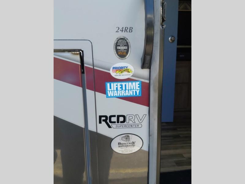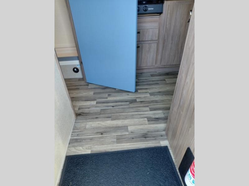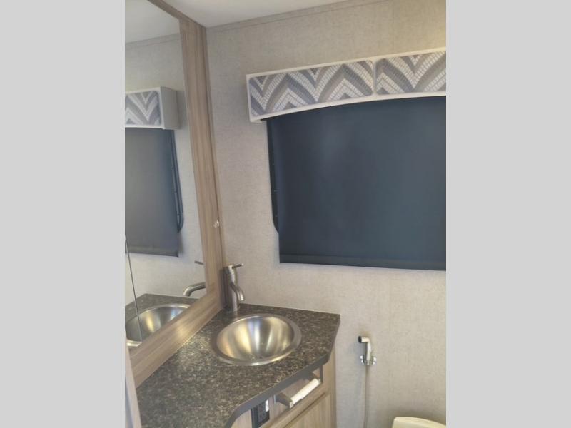 As you enter REV model 24RB you will find that the bathroom is located in the rear. To your immediate left there is a storage wardrobe for clothing, then inside the bath you will enjoy a shower, sink with overhead medicine cabinet, plus a toilet.