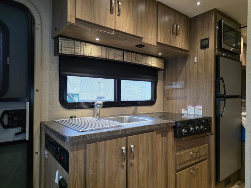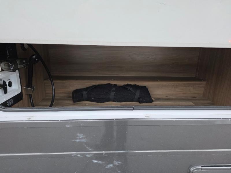 As you enter behind the front passenger seat you will find a double kitchen sink, a three burner range, overhead microwave, and a refrigerator to your immediate left. Across from the sink there is a sofa with two sets of seat belts to keep you rear travelers safe, and a removable table for dining. In the front overhead cab area there is a 32" LED TV which you are sure to enjoy, plus overhead storage as well.