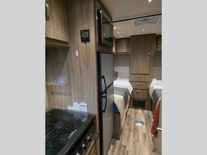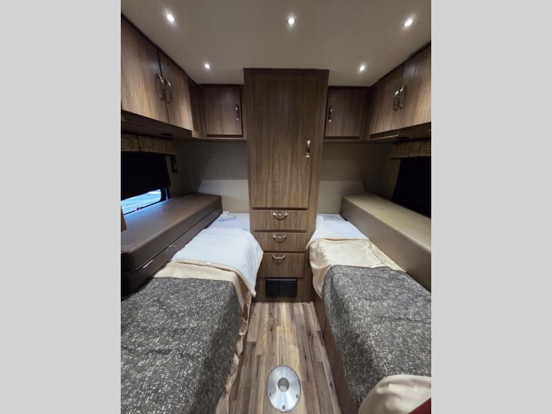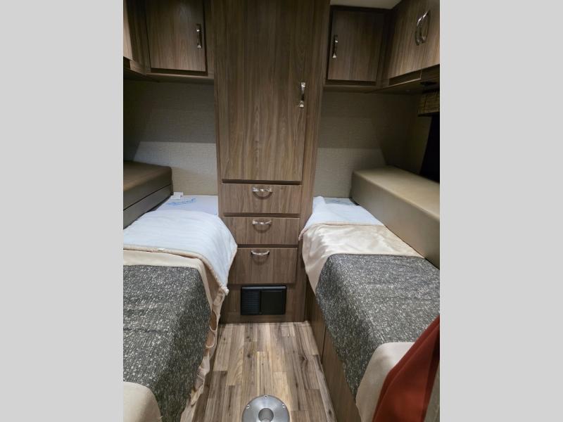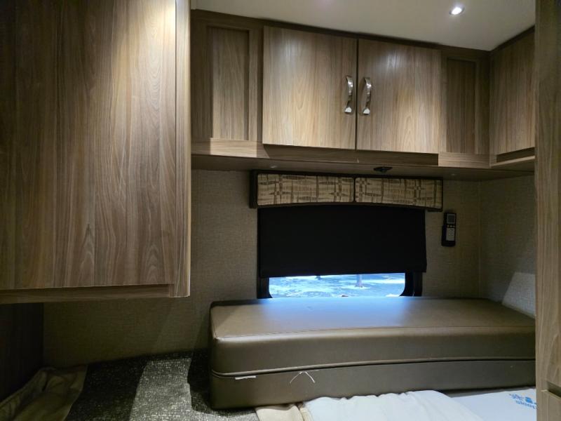 The very back features two twin beds with overhead cabinets, plus a wardrobe between the two for clothing storage. With the flex bed system you can create one full size bed for two instead of the two single twins if you wish.