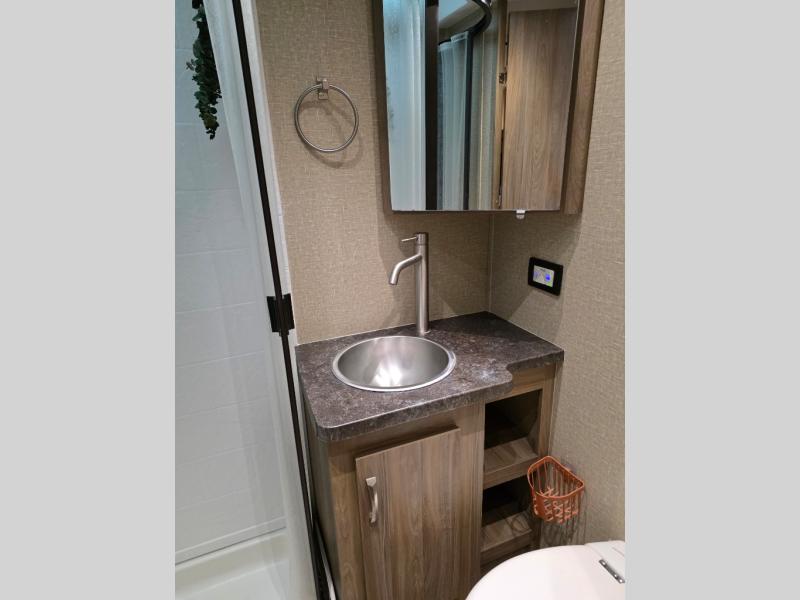 As you head toward the rear of the unit, the bathroom is on your right. Inside the bath you will find a sink, toilet, and corner shower.
