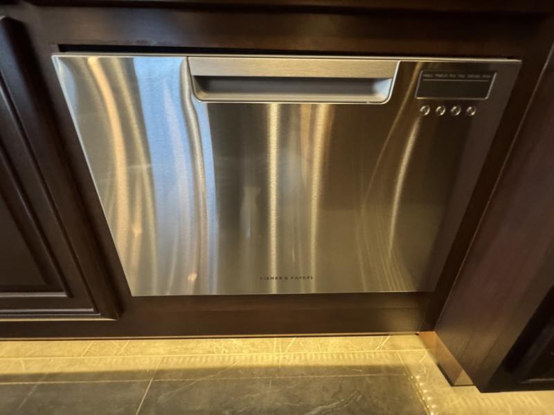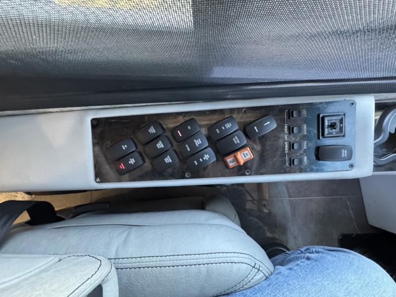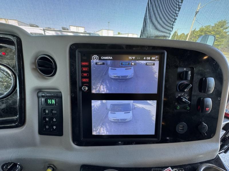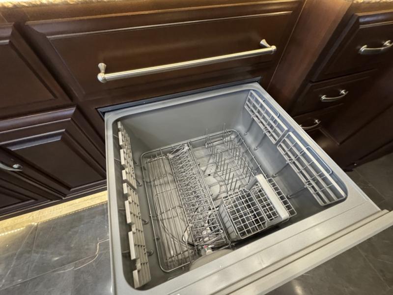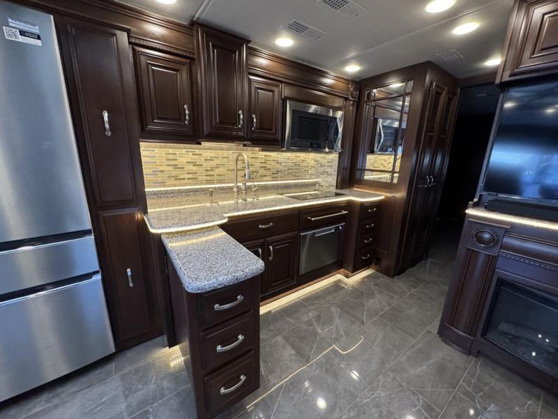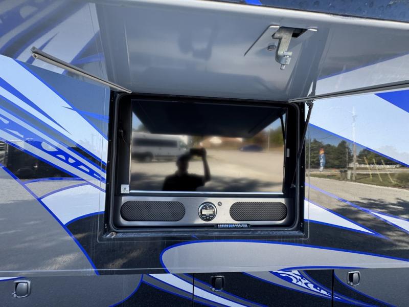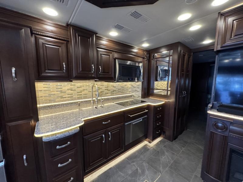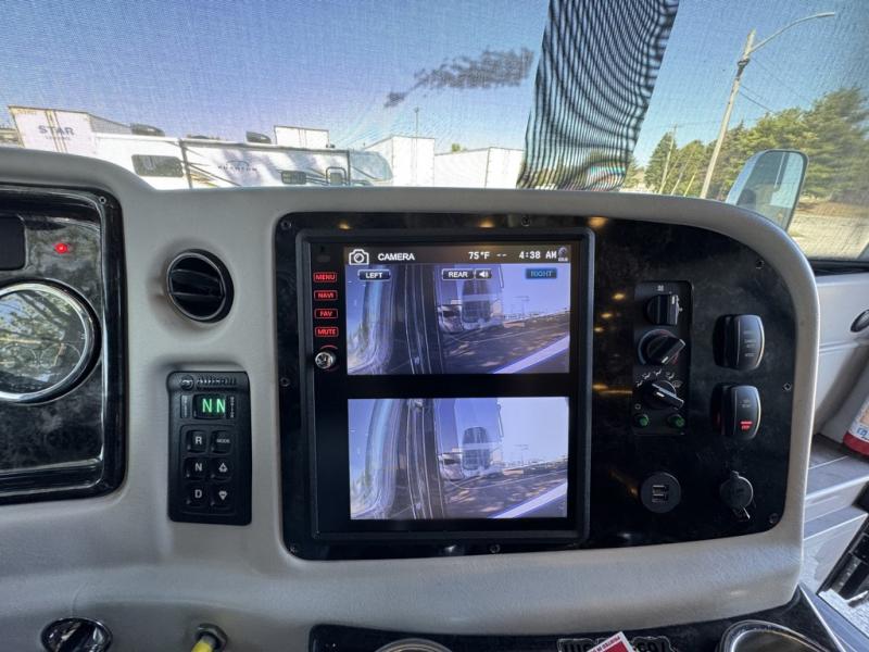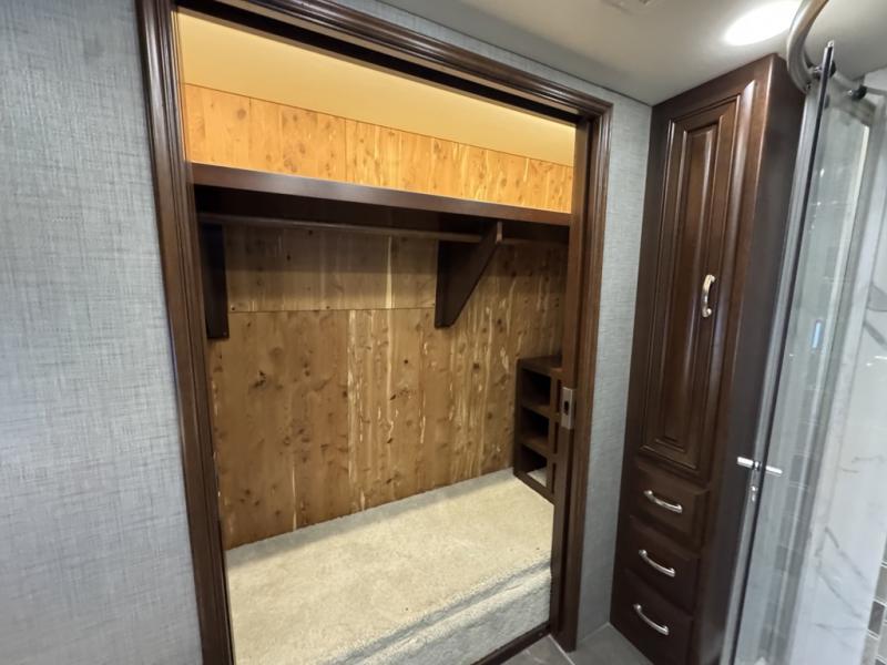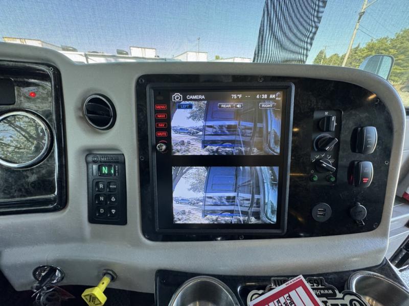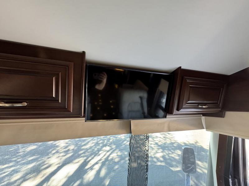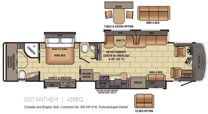 Stepping inside the motor home, along the passenger side there is a slide with a hide-a-bed sofa or an optional EZ bed sofa, a refrigerator, and a pantry. Plus there is a double kitchen sink, microwave, two burner range, and overhead cabinets for your dishes and things. Next to the slide you will find a washer and dryer. The opposite side of the motor home includes a slide with a sofa and dinette ensemble, or you can choose an optional hide-a-bed and free-standing table and desk with chairs. There is an entertainment center with a fireplace and a 48" LED TV located on the interior wall. Above the cab, you will find a 32" LED TV as well.