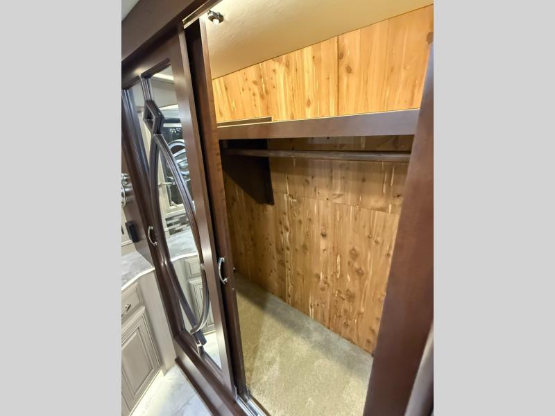 The bedroom offers a king bed slide and nightstands on either side of the bed. The opposite side of the motor home has a slide with a pantry that is mentioned above, a 32" LED TV, and vanity with drawers below.