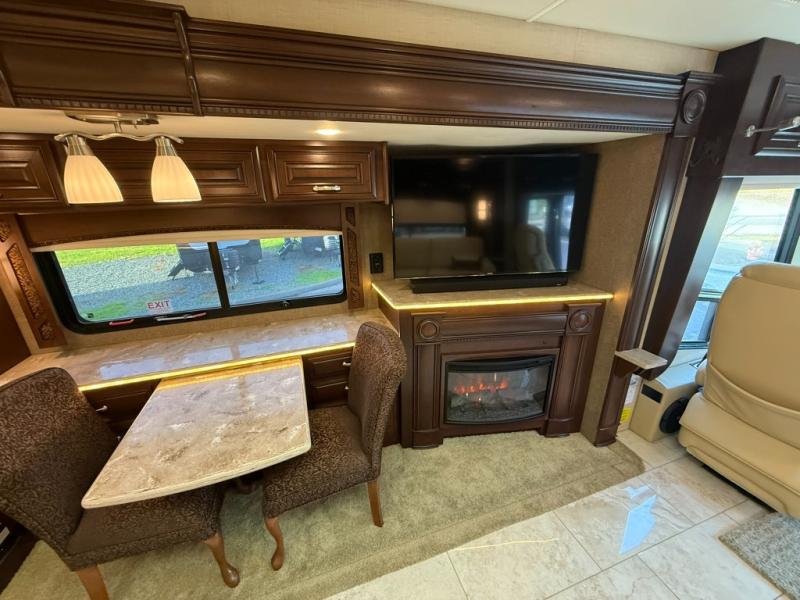 On the opposite side of the motor home you will find a slide out with an entertainment center, fireplace and 50" LED TV, dinette with chairs, overhead cabinets, and a refrigerator.