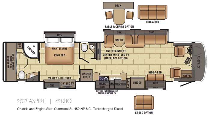 This Aspire 42RBQ class A diesel motor home by Entegra Coach offers quad slides for plenty of walking around room, a bath and a half, and an outside entertainment center with a 40" LED TV to watch your favorite shows in the great outdoors, plus more!