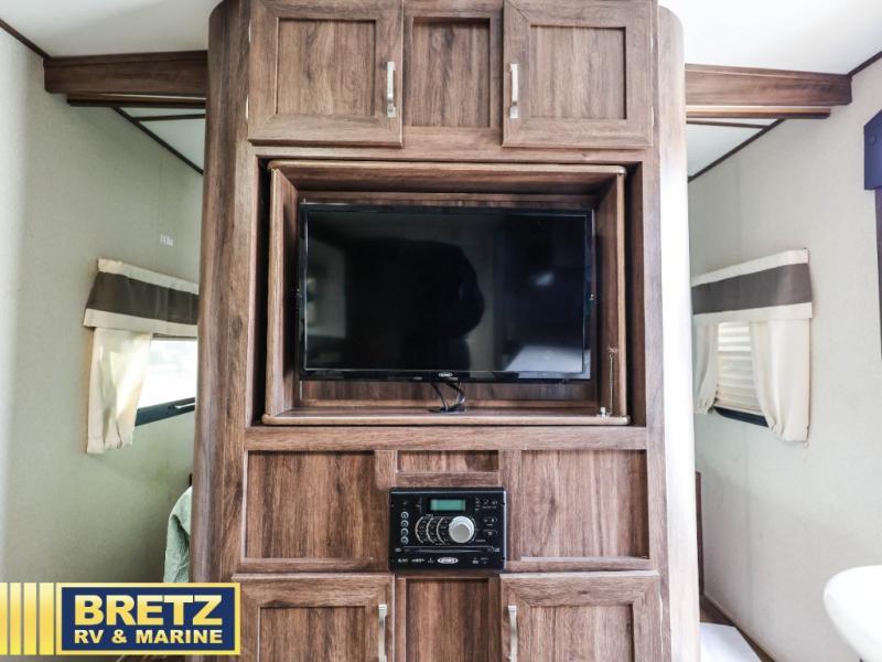 The main living area has a slide with a sofa and a dinette. Next to the slide there is a large pantry. On the opposite side of the trailer you will find a large kitchen sink, range, microwave, and refrigerator. Along the front of the living area you will also enjoy the LCD swivel entertainment center.