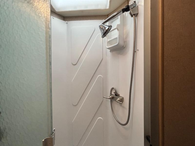 Beyond the slide out and kitchen area you have a complete bath including a shower, vanity with sink, toilet, and overhead medicine cabinet. There is also a pantry just outside the bathroom door.