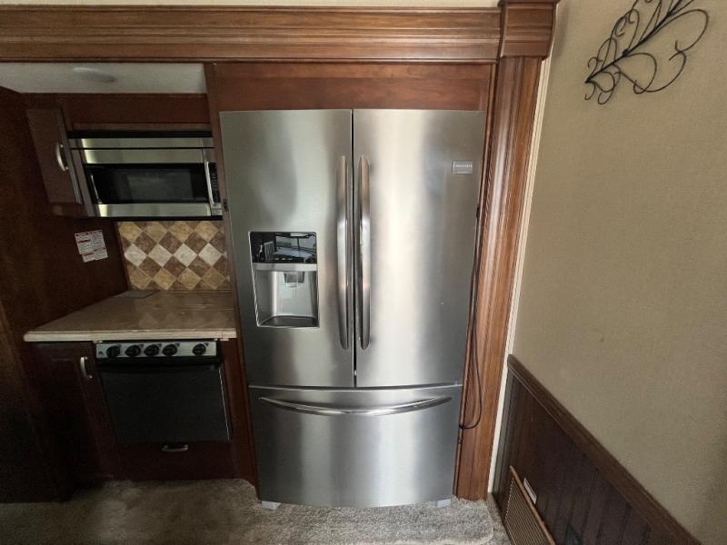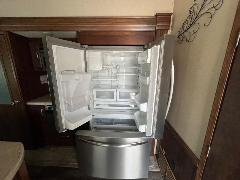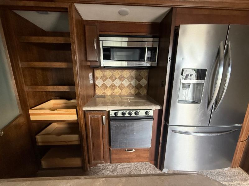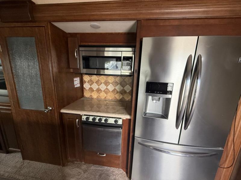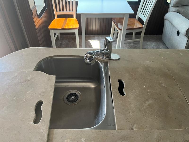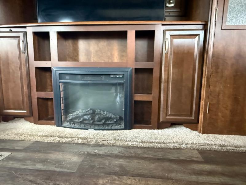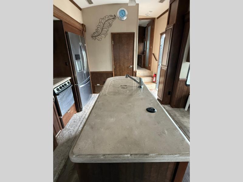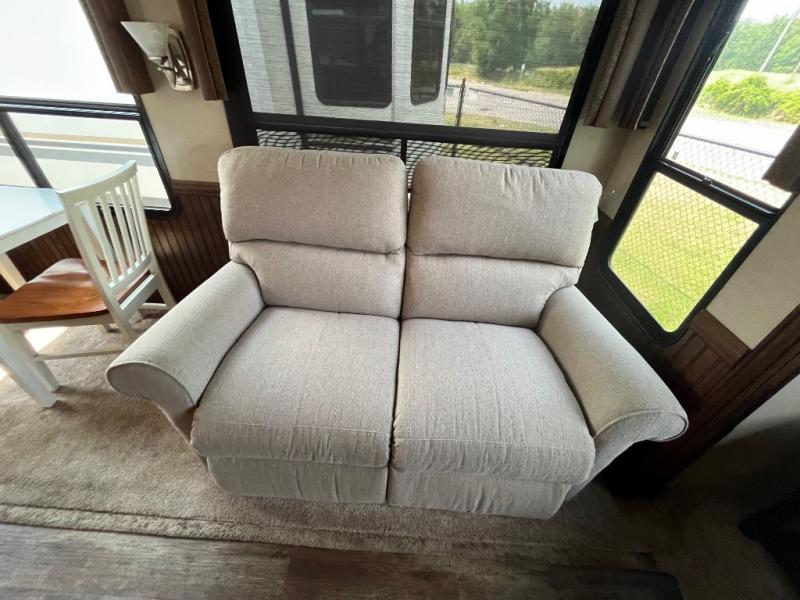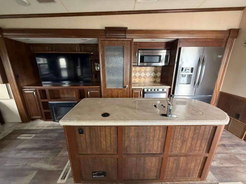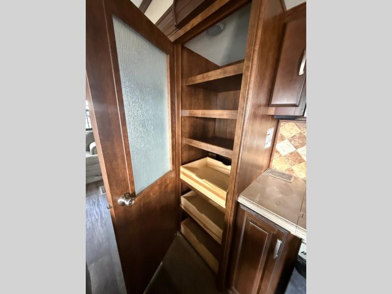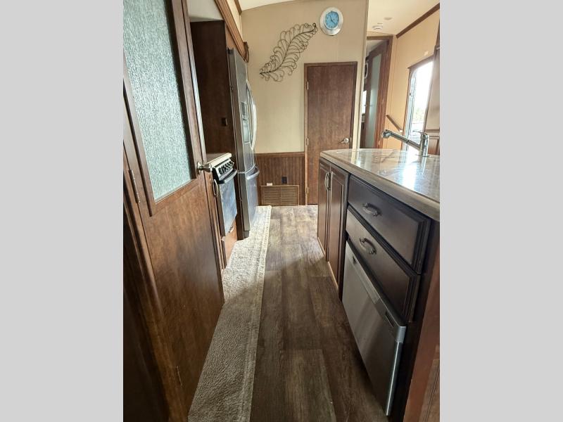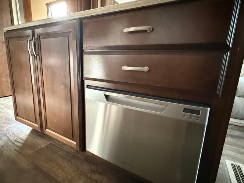 To the left of the entrance there is a convenient closet which can be used to hold coats. The first slide has a free-standing dinette or you can choose an optional booth dinette, and two recliners or you can choose optional theater seats. On the opposite side of the fifth wheel the second slide has a 58" pop-up TV with a fireplace below the TV, pantry, microwave, three burner range, and three door refrigerator. Along the rear of the living area there is a 90" sofa hide-a-bed, and in the middle of the kitchen you will enjoy the island which has a double kitchen sink.