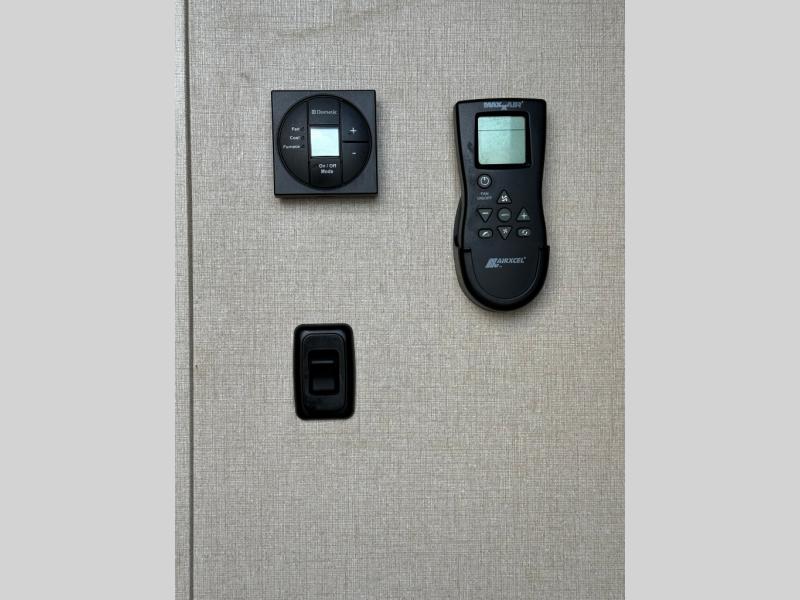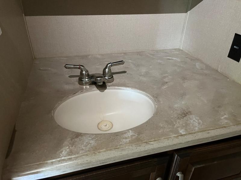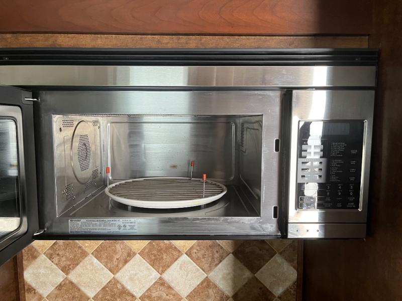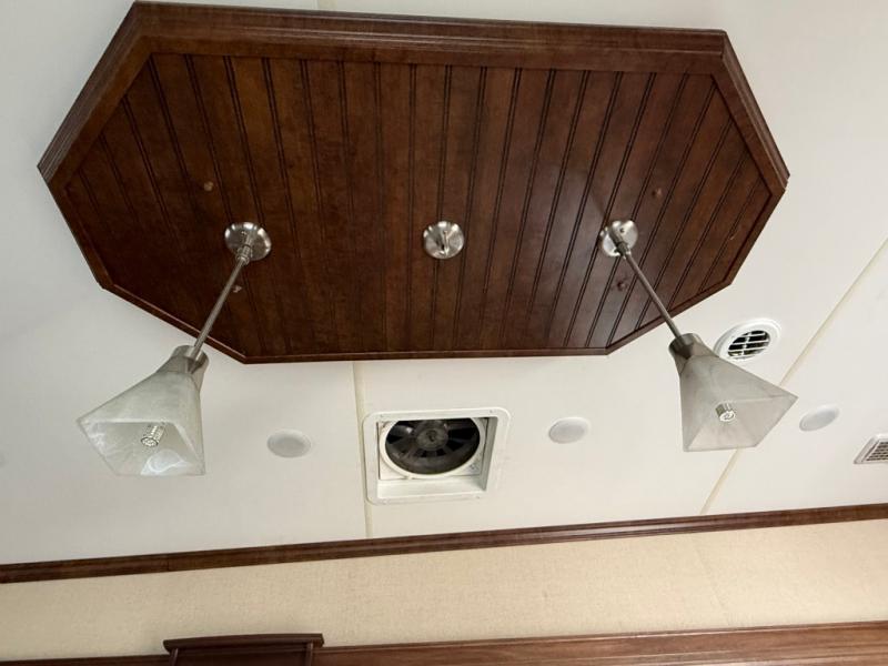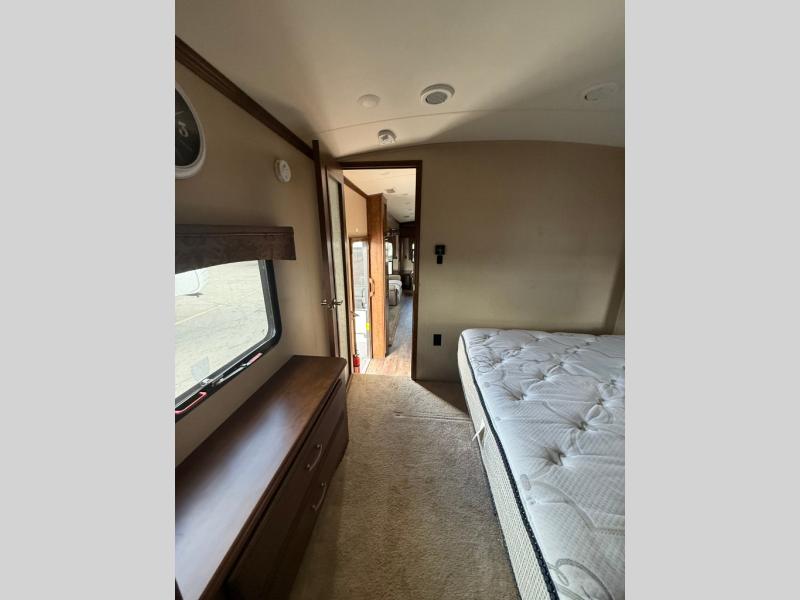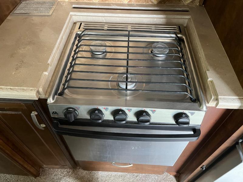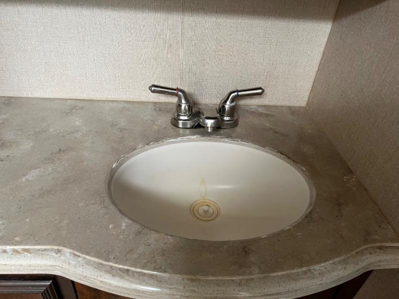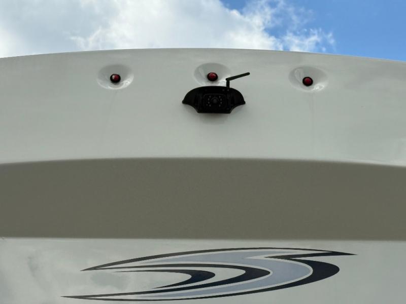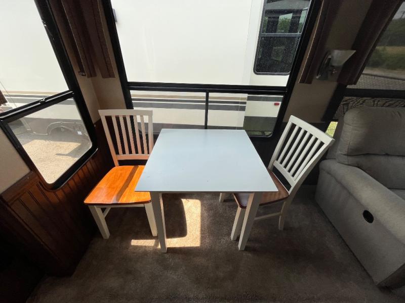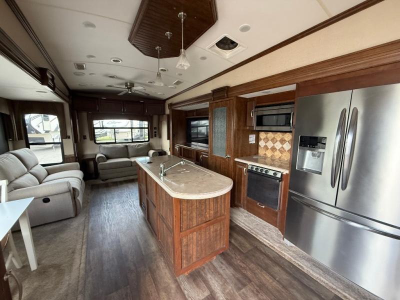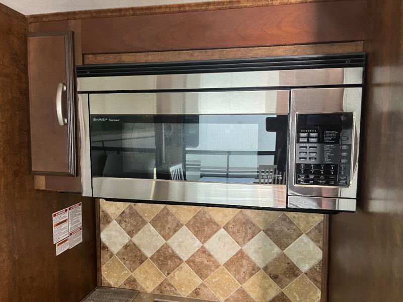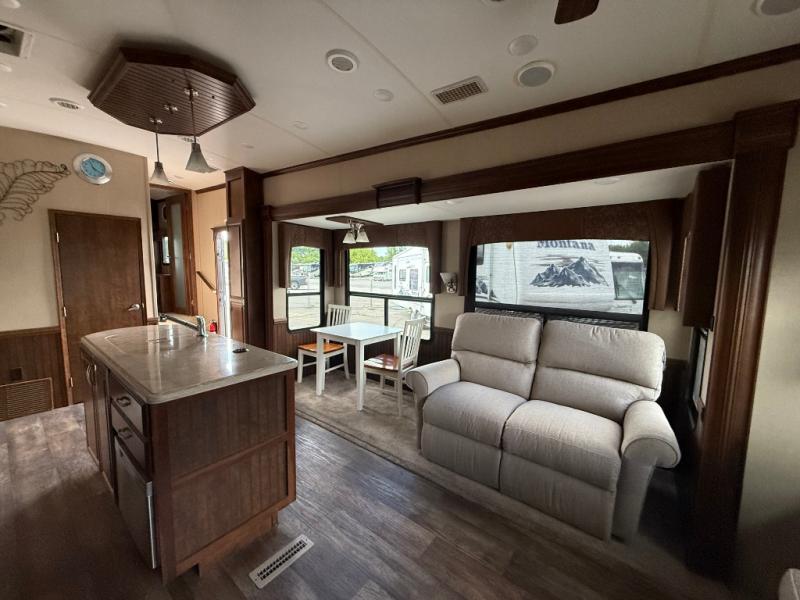To the left of the entrance there is a convenient closet which can be used to hold coats. The first slide has a free-standing dinette or you can choose an optional booth dinette, and two recliners or you can choose optional theater seats. On the opposite side of the fifth wheel the second slide has a 58" pop-up TV with a fireplace below the TV, pantry, microwave, three burner range, and three door refrigerator. Along the rear of the living area there is a 90" sofa hide-a-bed, and in the middle of the kitchen you will enjoy the island which has a double kitchen sink.