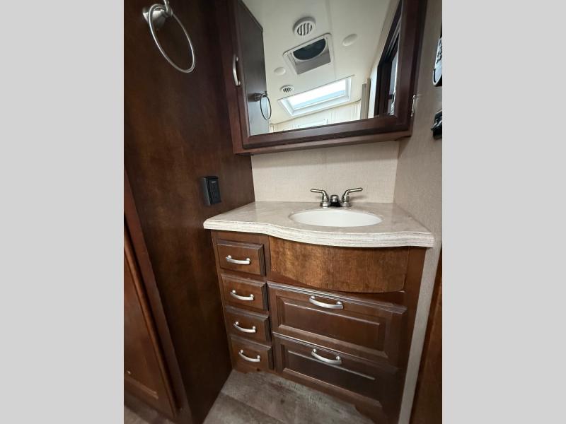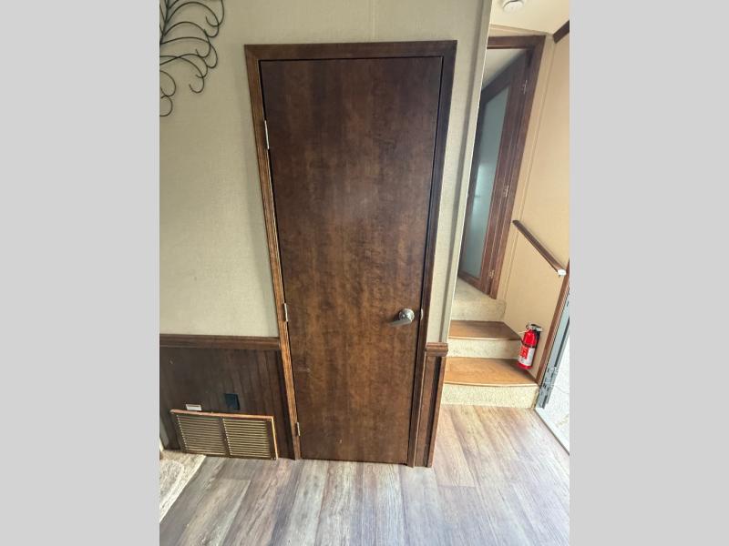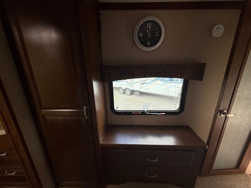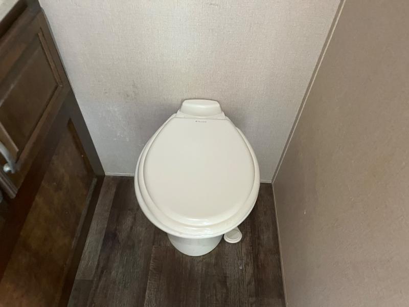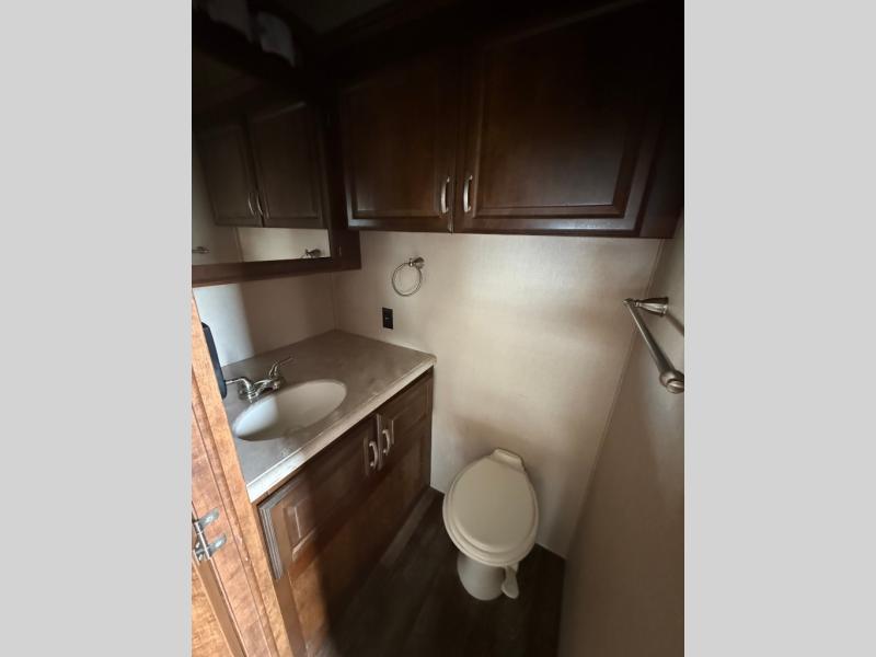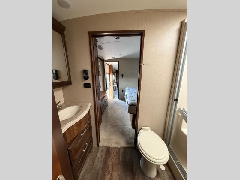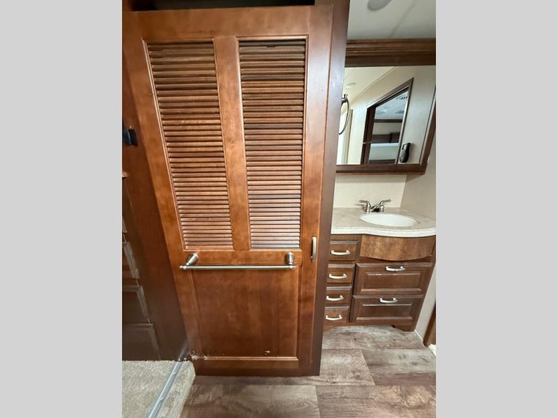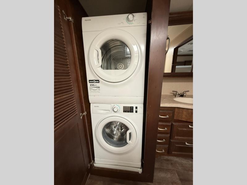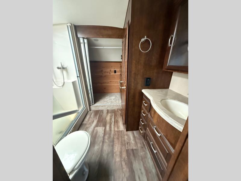 The bathroom is located in the front of the fifth wheel. Inside the bathroom there is a large shower, toilet, sink, closet for a washer and dryer, dresser, and large wardrobe, plus much more!
