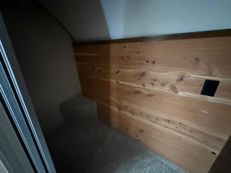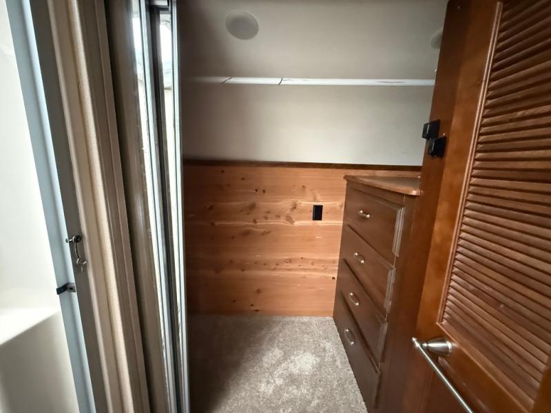 At the top of the stairs you will be in the bedroom. There is a slide with a king bed or you can choose an optional queen. Across from the bed there is a dresser with a TV above the dresser and an armoire.