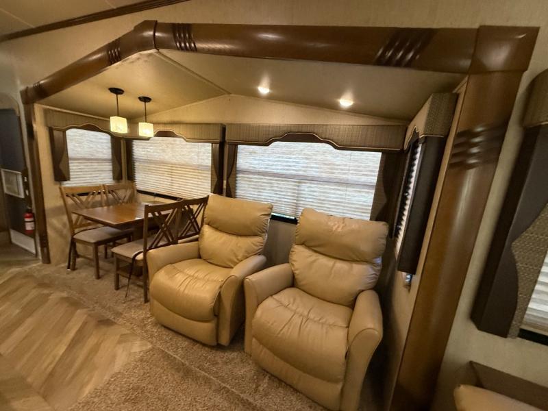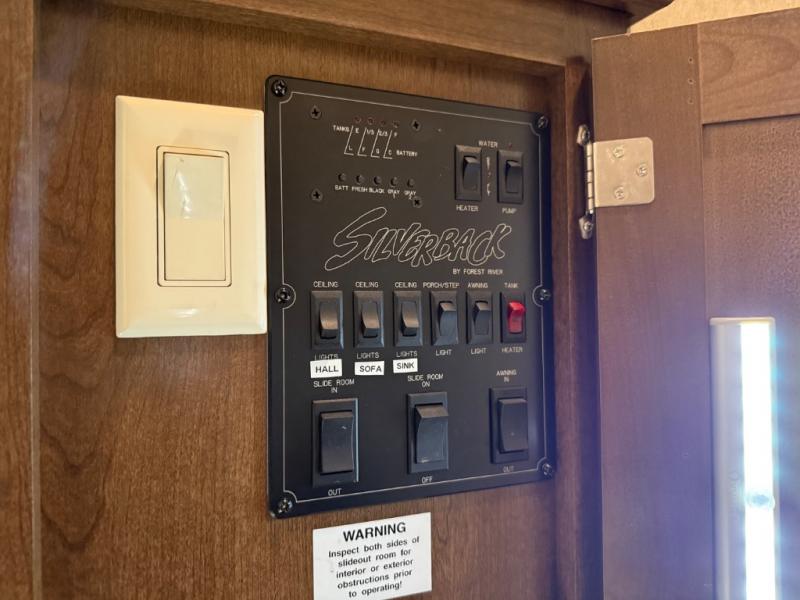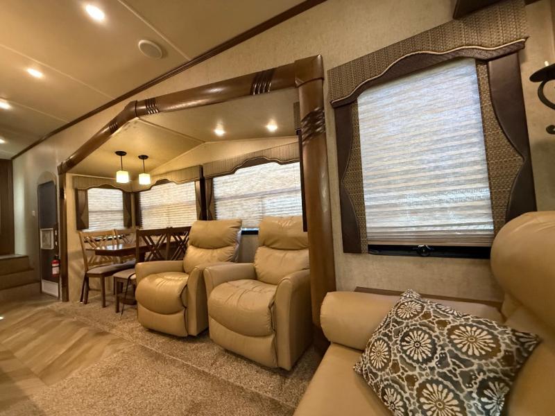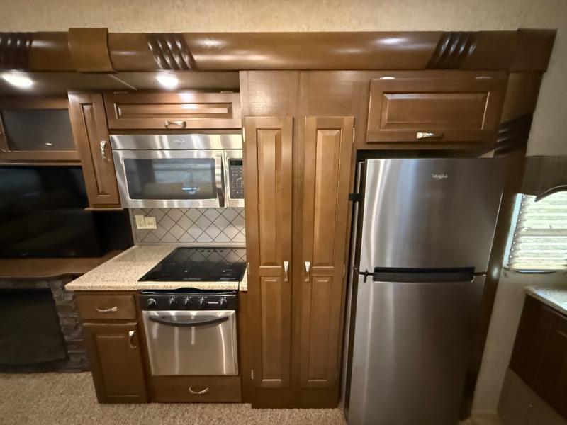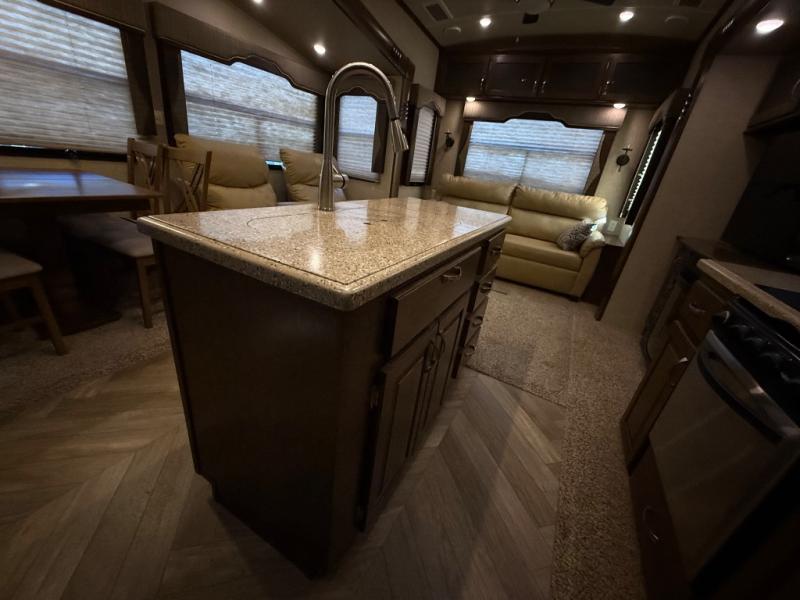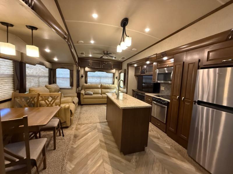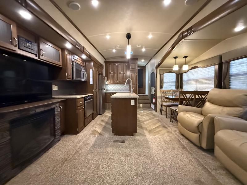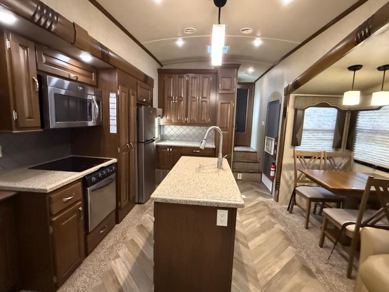 As you look at the Cedar Creek Silverback 33IK fifth wheel by Forest River you will notice that this fifth wheel has triple slides and a kitchen island.