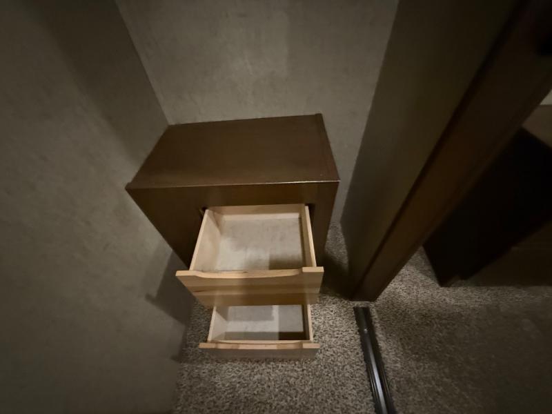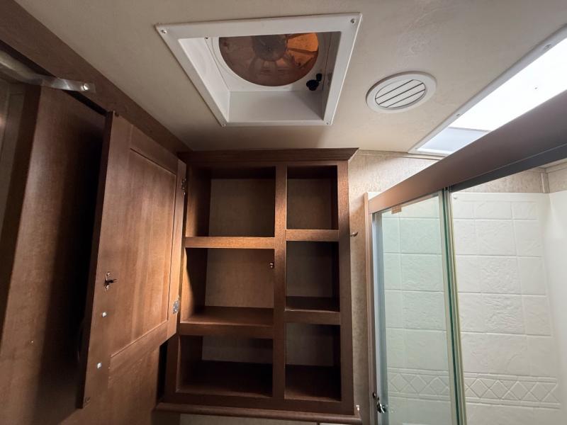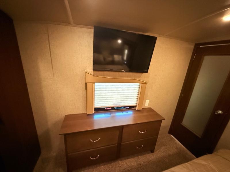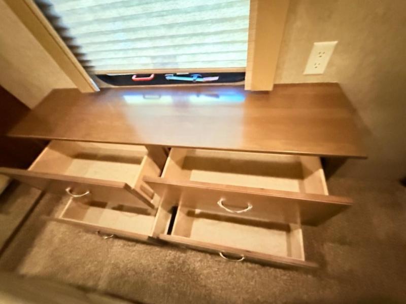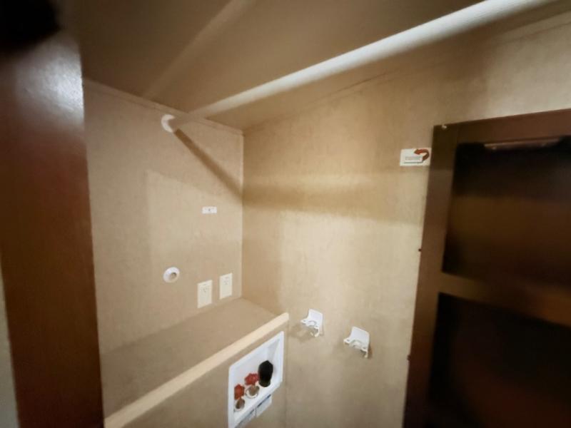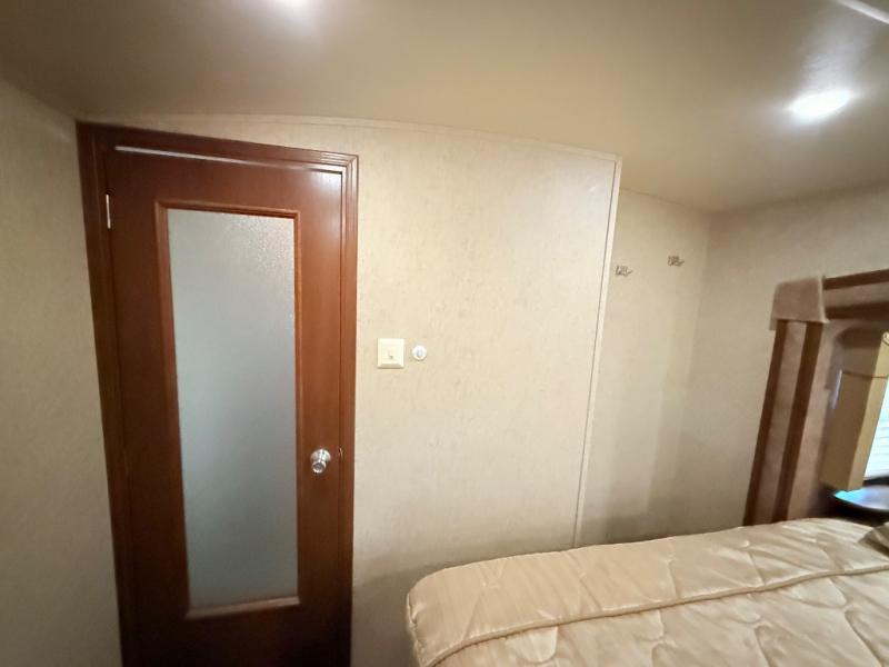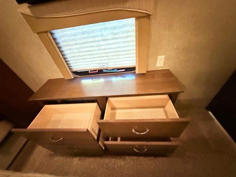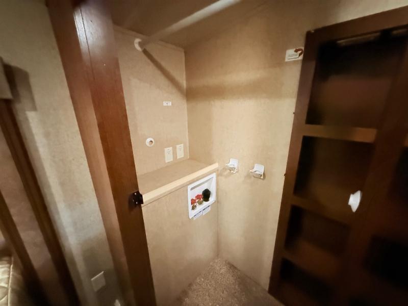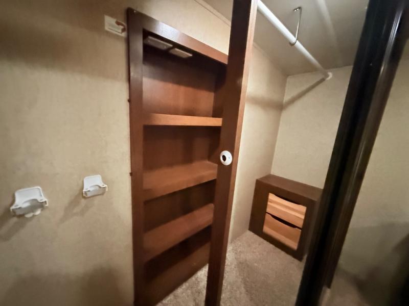 In the front bedroom there is a queen bed slide, or you can choose an optional king if you wish. This slide features a cathedral ceiling like the curb side slide in the main living area. Across from the bed there is a dresser with TV, and along the front wall you have plenty of storage with a full wardrobe. The wardrobe is even prepped for a stackable washer/dryer, and there are shelves on one side and drawers on the other, plus so much more!