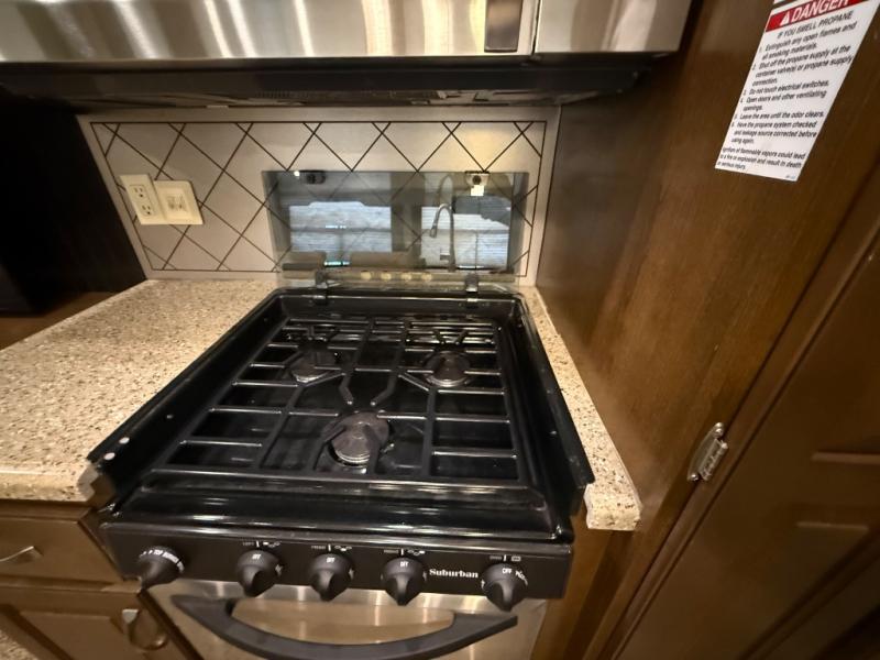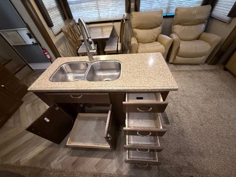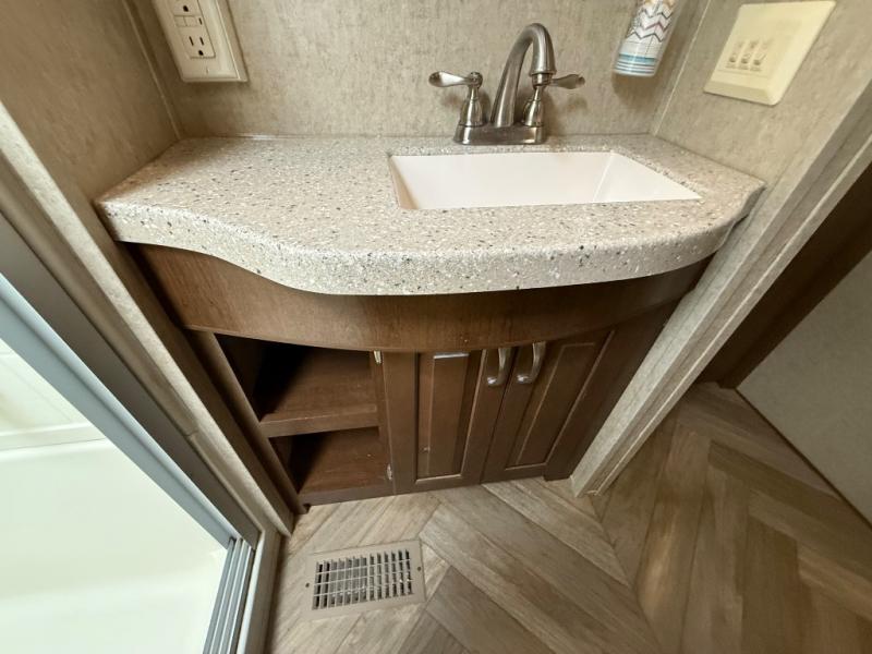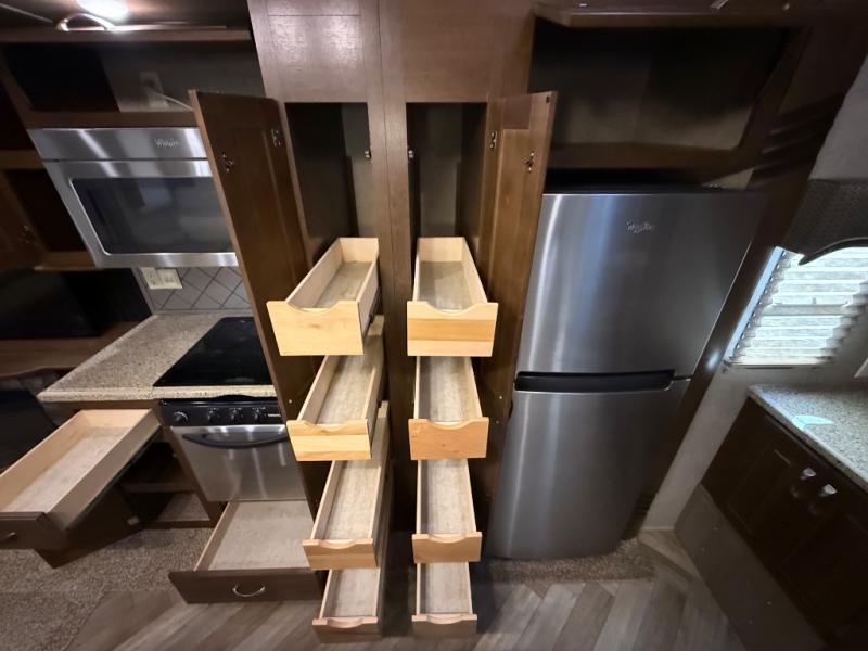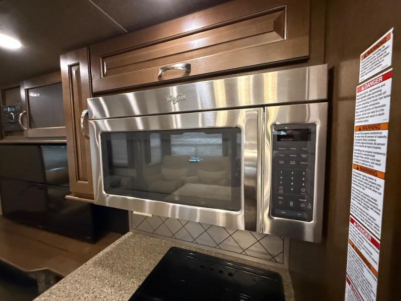 With its triple-slide layout, this beauty offers an open and inviting living space, complete with cozy theater seating, a free-standing dinette, and a kitchen island that screams gourmet-on-the-go. The residential refrigerator, solid surface countertops, and ample cabinetry mean you never have to sacrifice home comforts while you chase sunsets.