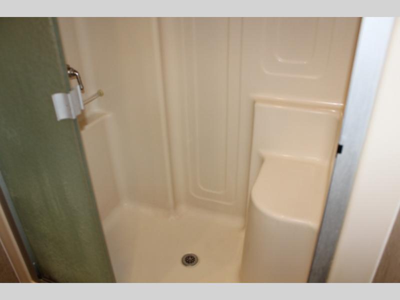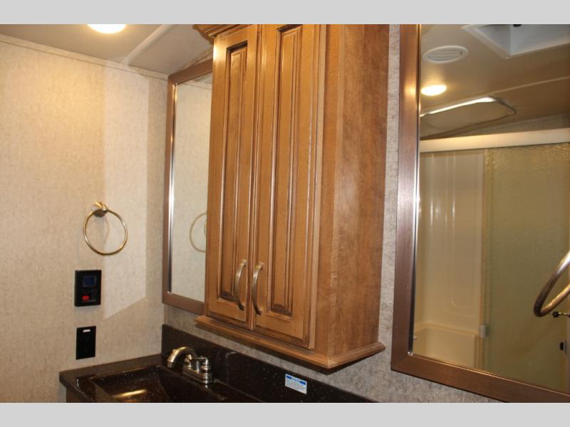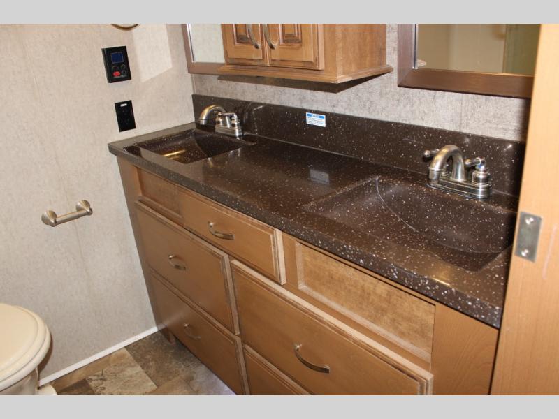 Up the steps towards the front of the fifth wheel find a full bathroom on your left. It includes a vanity with two sinks, a medicine cabinet, a nice size shower with seat, toilet, and overhead cabinet.